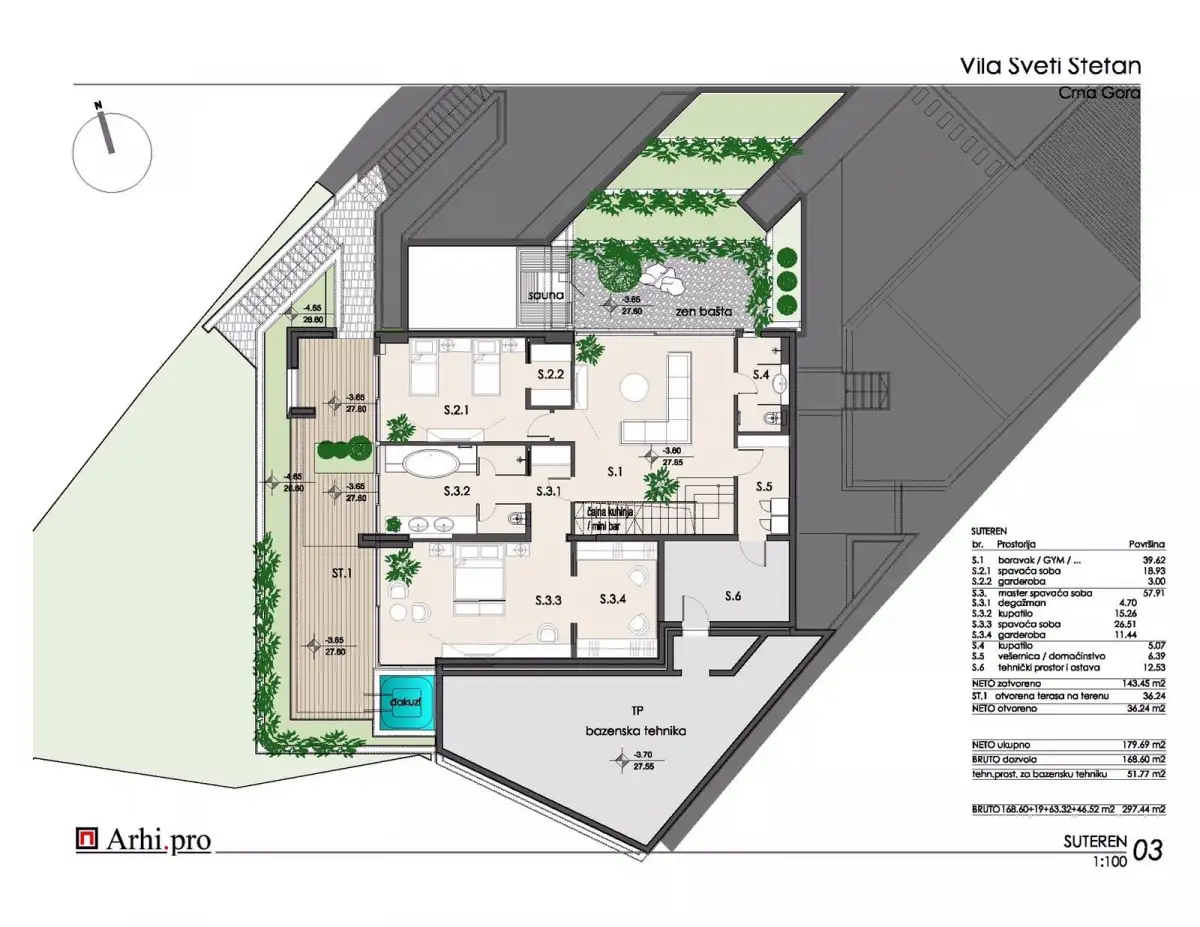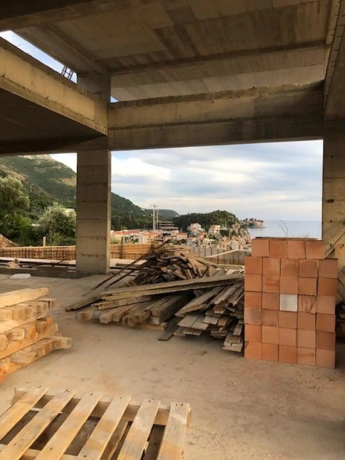 Modern villa under construction located on the first line is located in the village Milocer, near Sveti Stefan. The area of the villa is 646 m2, consists of two levels. The first level consists of a living room, 3 bedrooms, one of which has a private jacuzzi, wardrobe, laundry room and bathroom. The second level - a spacious kitchen-living room with dining area, bedroom, bathroom, a spacious terrace with a swimming pool with gorgeous sea views. The plot of 1000 m2 has parking for 2 cars, a garage. Stairs lead to the sea.