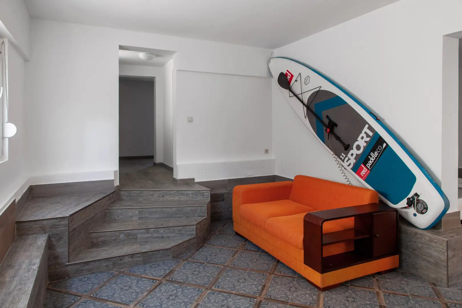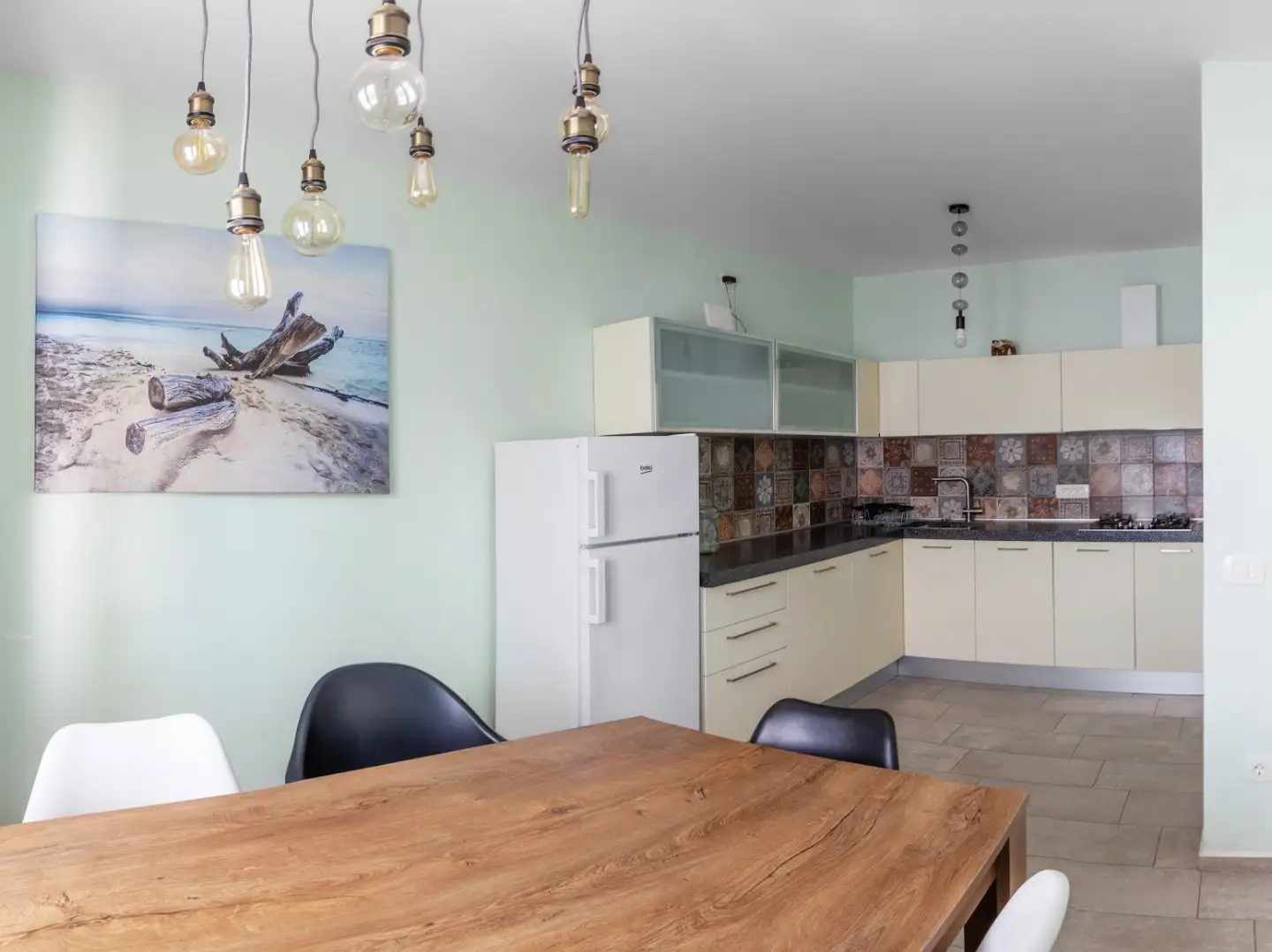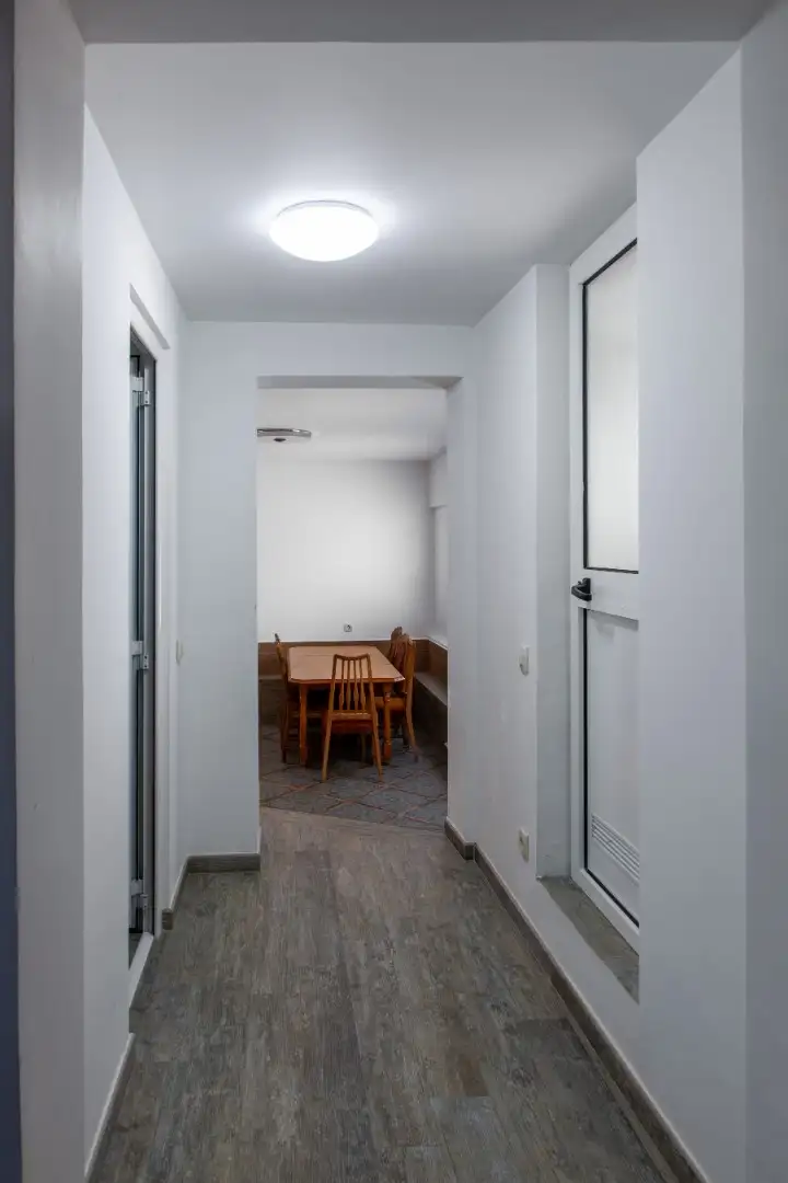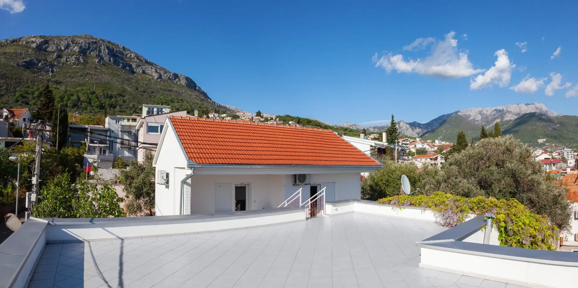 House 1: Semi-basement floor (designed as a commercial floor): entrance hall, bathroom with shower, living room, double and single bedroom, technical room with boiler. This floor has heating and fan coil units, but is generally cool in summer and warm in winter by itself. Second floor: entrance hall, studio type living room with a single sofa bed with kitchen, bedroom and bathroom with bath, flat roof with tiles and sea and mountain views.