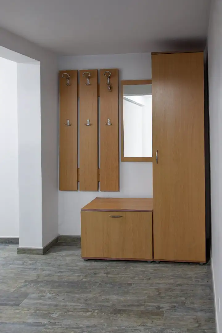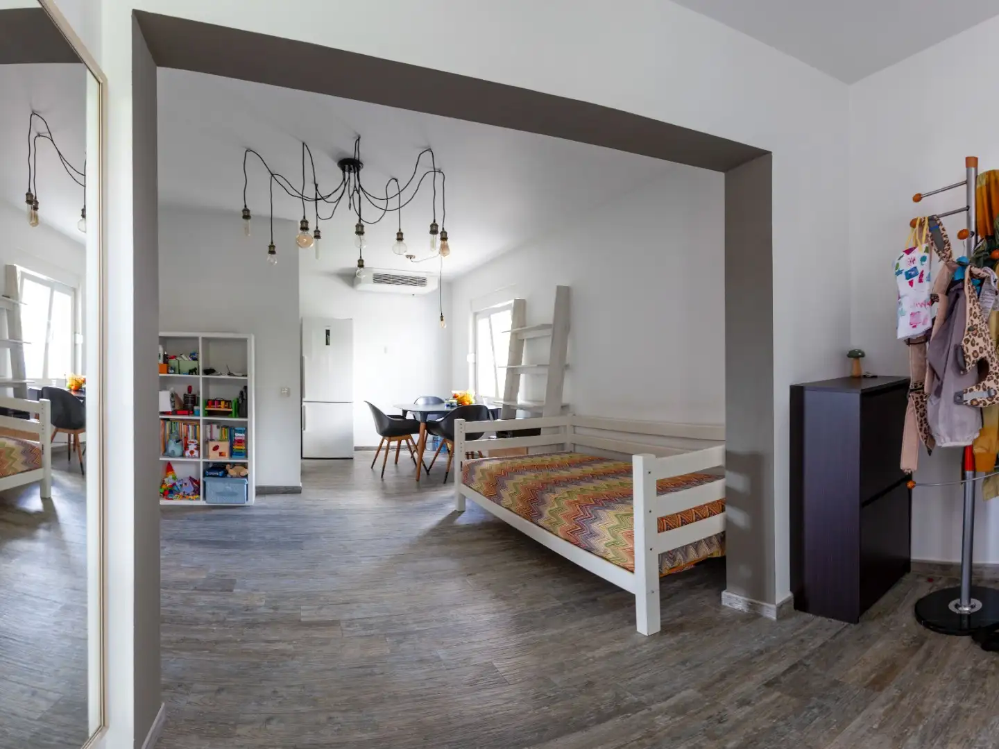 House 2. First floor: entrance hall, large kitchen, bathroom with shower room, bedroom with access to the garden. On the street side there is an entrance to a shed where bicycles, lawnmower etc. are stored. Second floor: two similarly structured bedrooms with en-suite shower room with separate entrances.