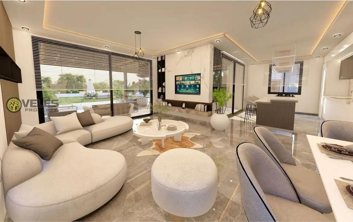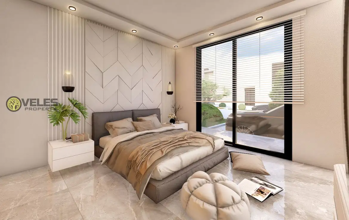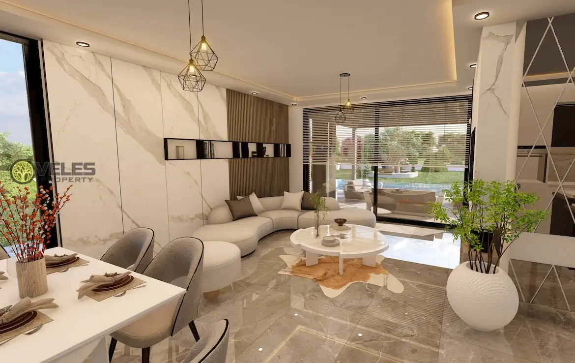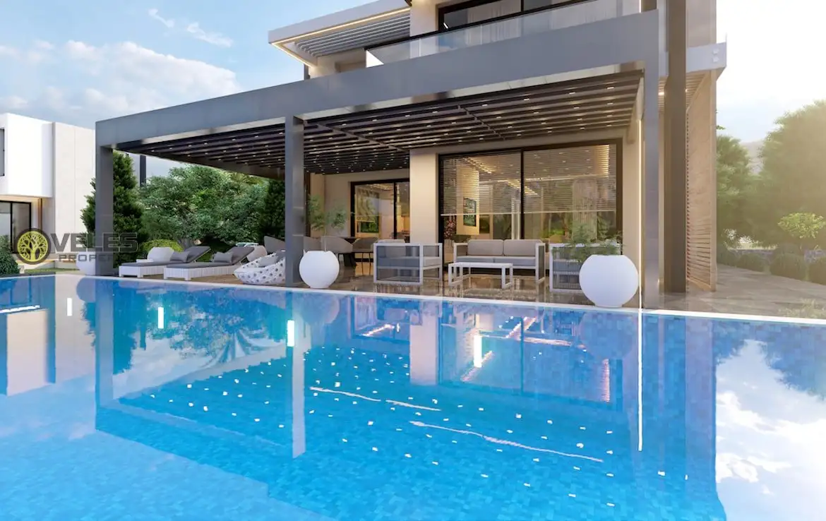 Project features. These are 5 privileged luxury villas. Luxury living area on a plot of 800-900 m2. Each villa has 4 bedrooms. Private pool in the garden (with a barbecue area). Electronic fireplace with a glass cover. Internet, satellite communication, and outdoor surveillance camera. Automatic garage door of the villa with remote control. All finishing materials meet high standards. Storage in the garden. Private parking space of 30m2.