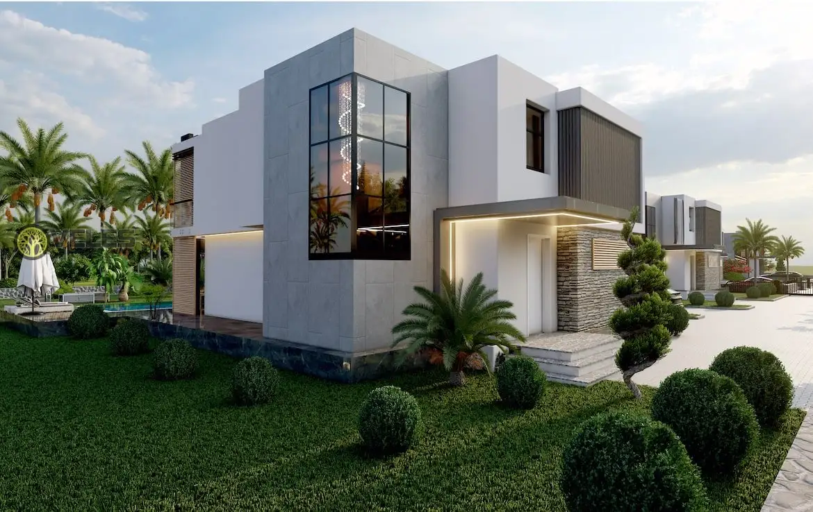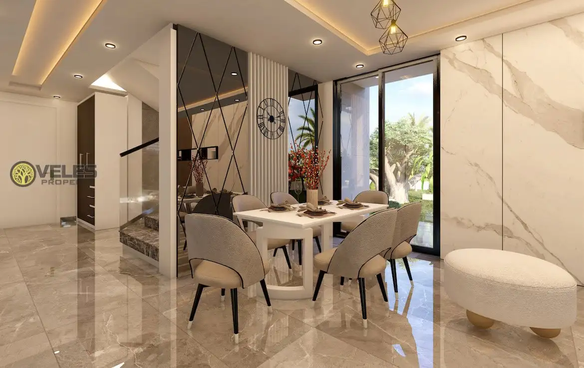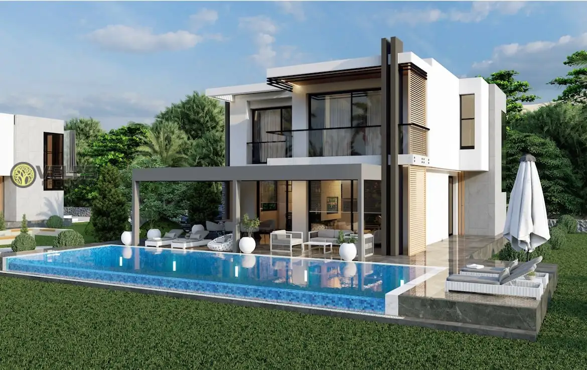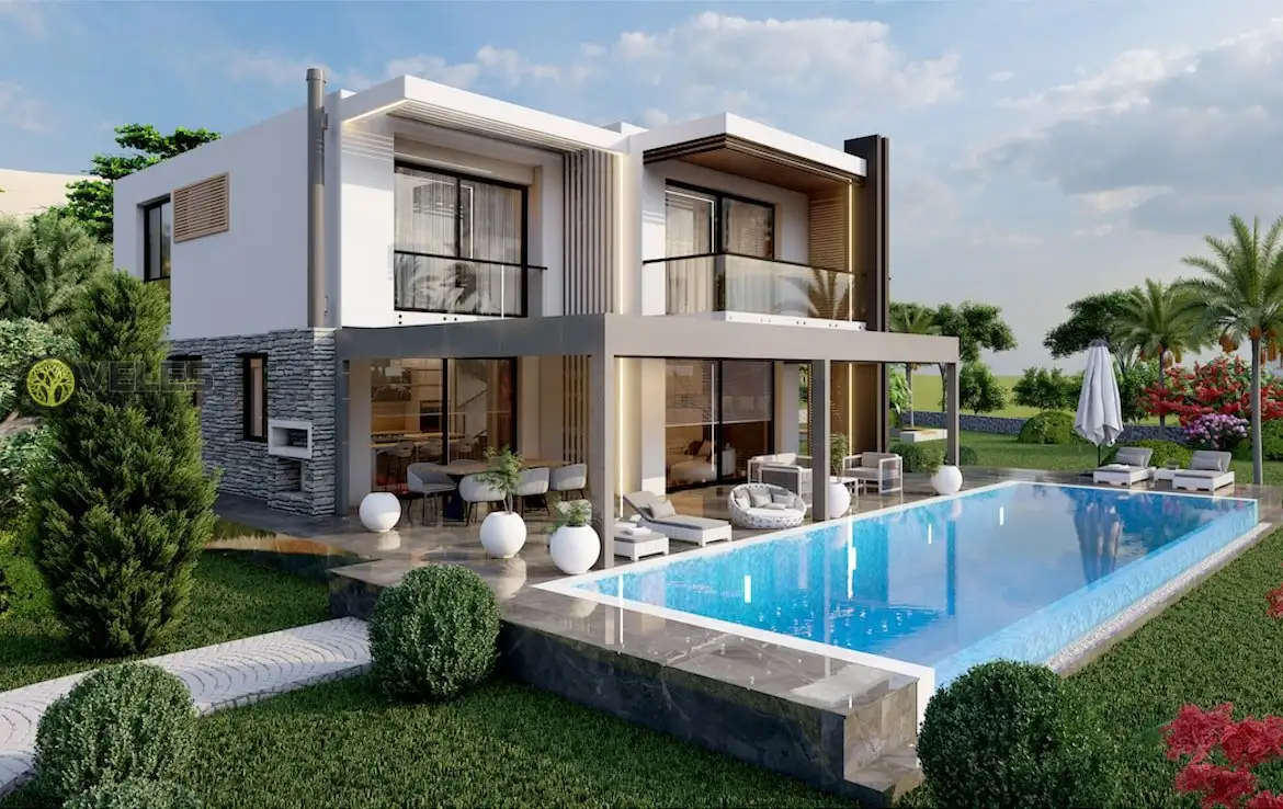 Project features. These are 5 privileged luxury villas. Luxury living area on a plot of 800-900 m2. Each villa has 4 bedrooms. Private pool in the garden (with a barbecue area). Electronic fireplace with a glass cover. Internet, satellite communication, and outdoor surveillance camera. Automatic garage door of the villa with remote control. All finishing materials meet high standards. Storage in the garden. Private parking space of 30m2.