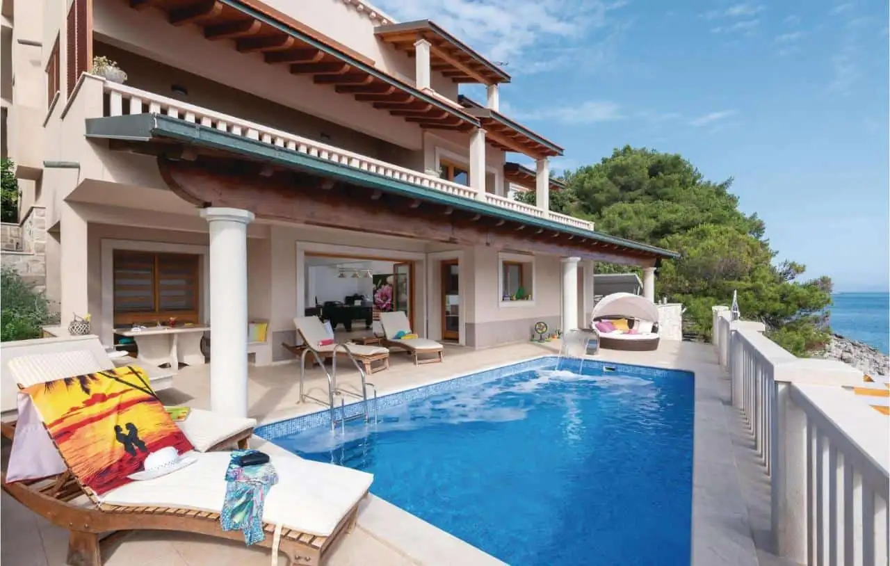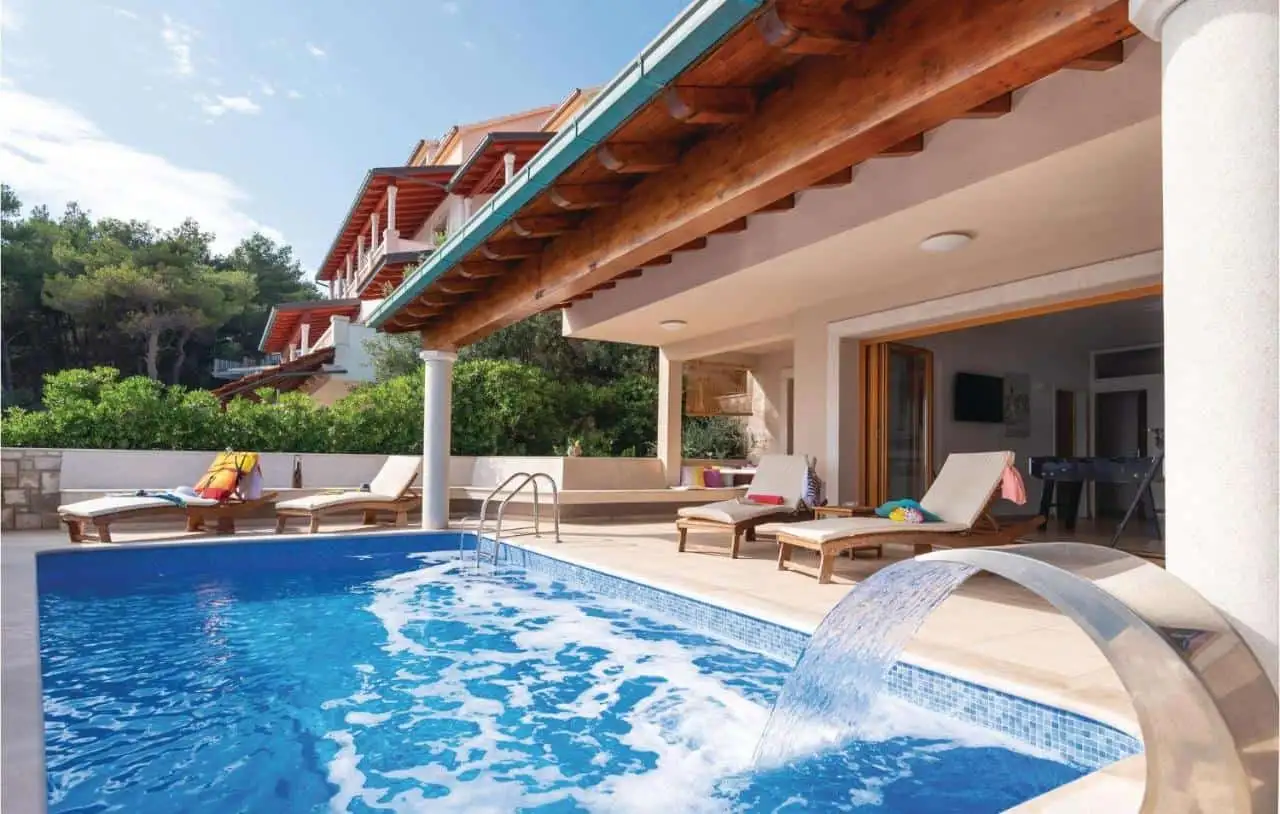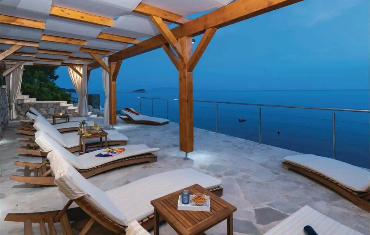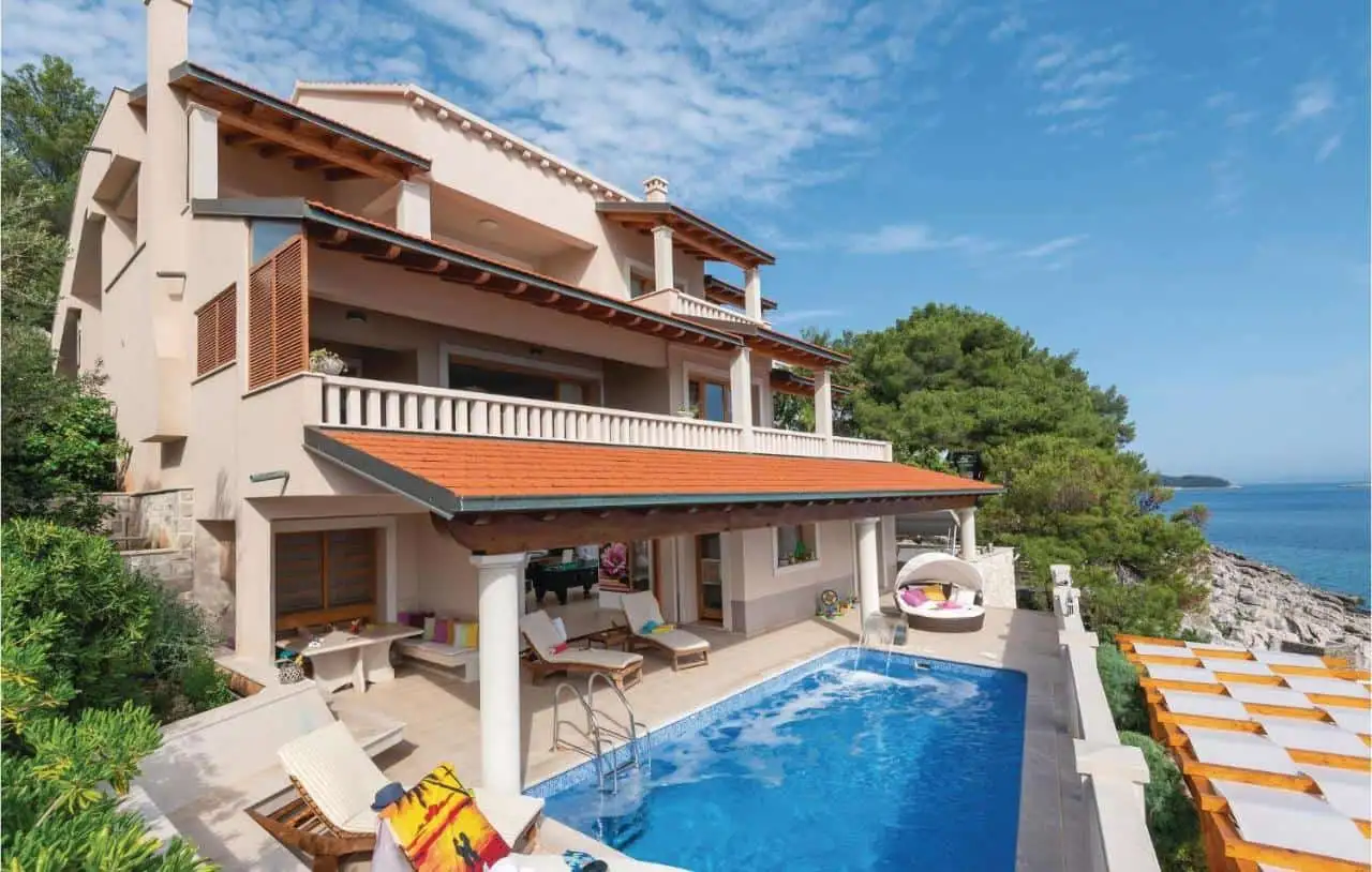 Location: KorculaBuilt: 2013Renovated: 2022City center: 5 kmDistance to airport: 80 kmInterior space: 330 m2Plot area: 557 m2Bedrooms: 5Bathrooms: 5Pool: 21 m2Parking: 6Air conditioningGymSaunaPatioChildren's playgroundGarden
