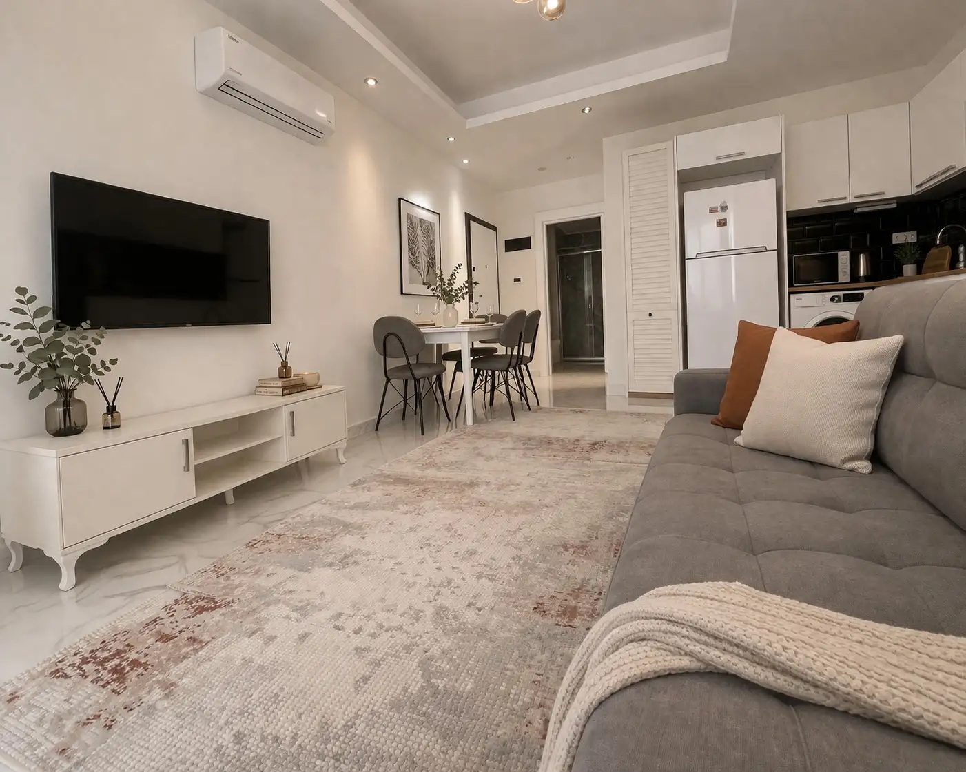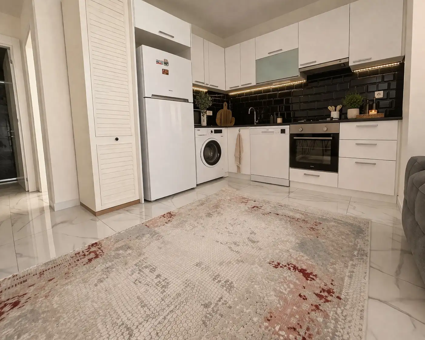 The main advantage is a good location. Only 300 meters to the beach, where in addition to the clear sea you will find tennis courts and a football field for active recreation. 100 meters away is the main street with public transport stops, making it easy to reach any part of the city. There are also cozy restaurants and cafes. Within walking distance is the Carrefour supermarket, where you can always buy fresh produce, including fish and meat. And just 600 meters away is a popular Tuesday market in Kestel with fresh vegetables, fruits and local delicacies.