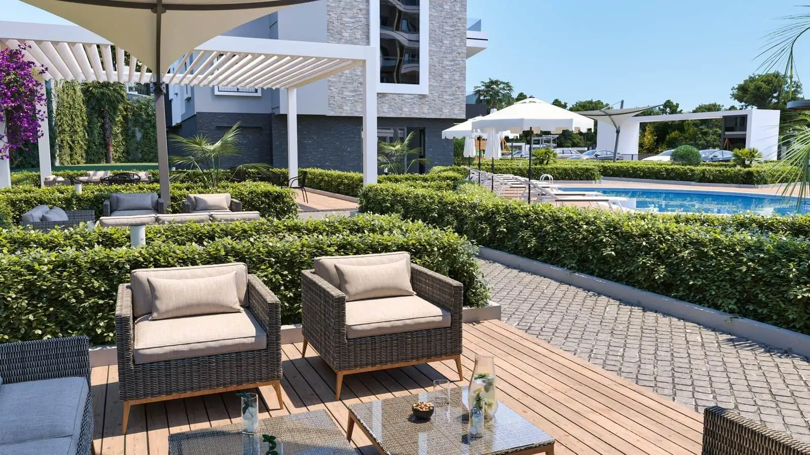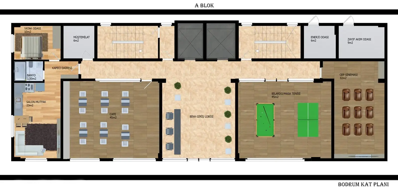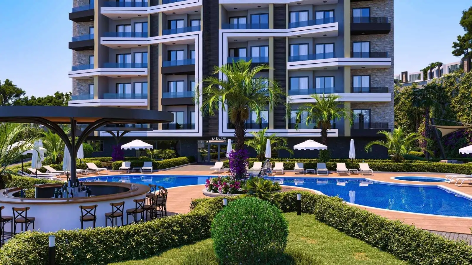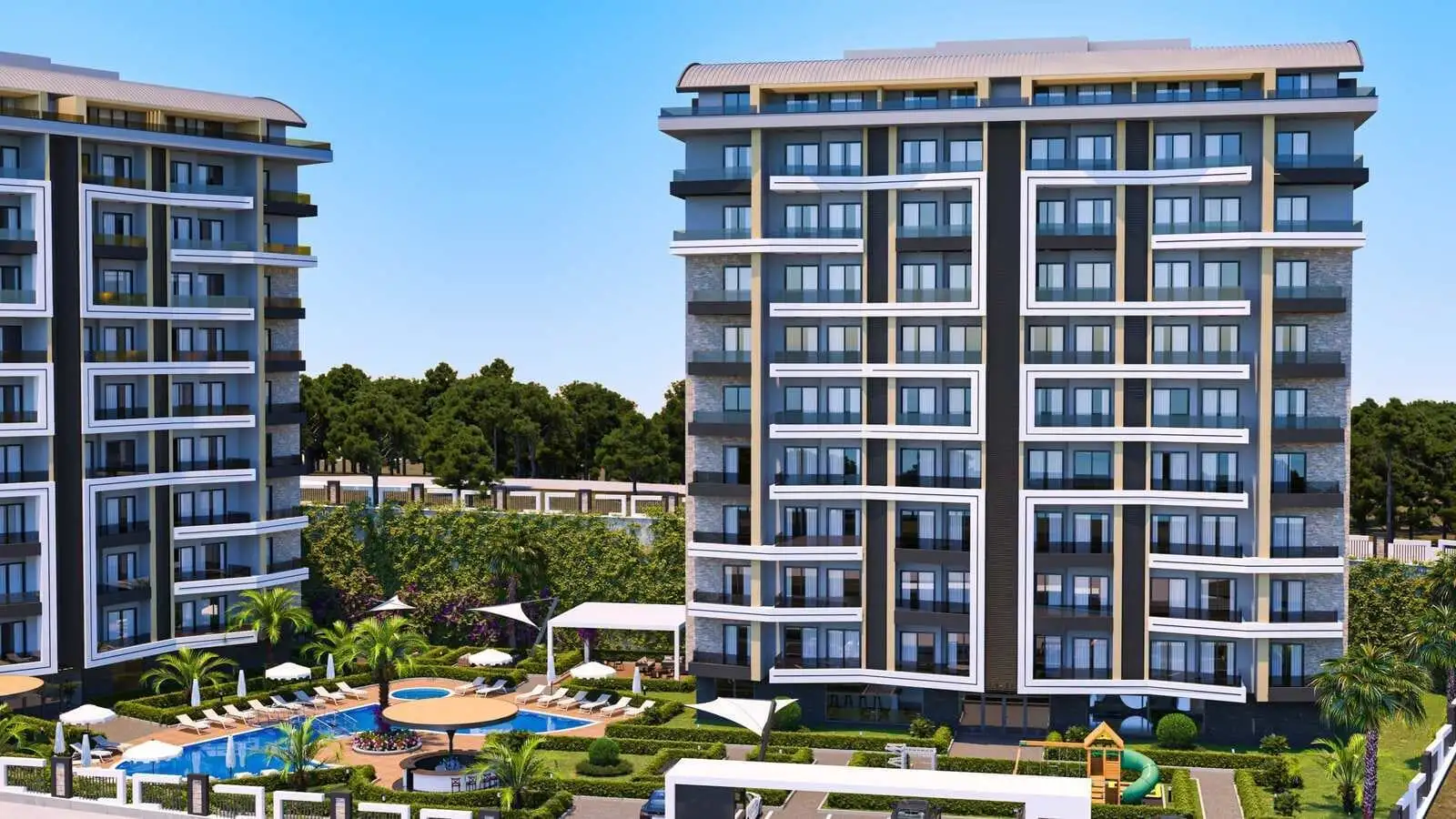 The complex will consist of two residential blocks for 93 apartments. In a closed, protected area with landscape design, there will be an outdoor pool, a children's pool, arbors for recreation, a recreation area and a barbecue, open parking for cars and bicycles, a mini club, a cinema, recreation rooms, an indoor pool, a Finnish sauna, a hamam, fitness, a generator. The territory of the complex will be under round-the-clock security; video surveillance cameras, satellite TV will be installed. For residents of the complex, the shuttle will run to the sea, through the center of Avsallar.
