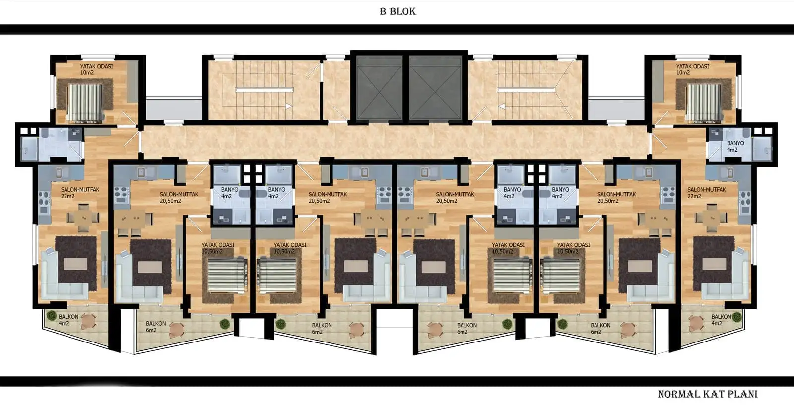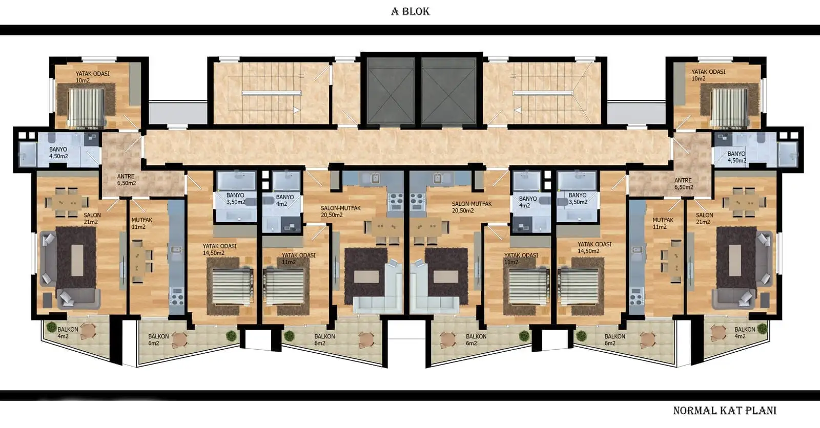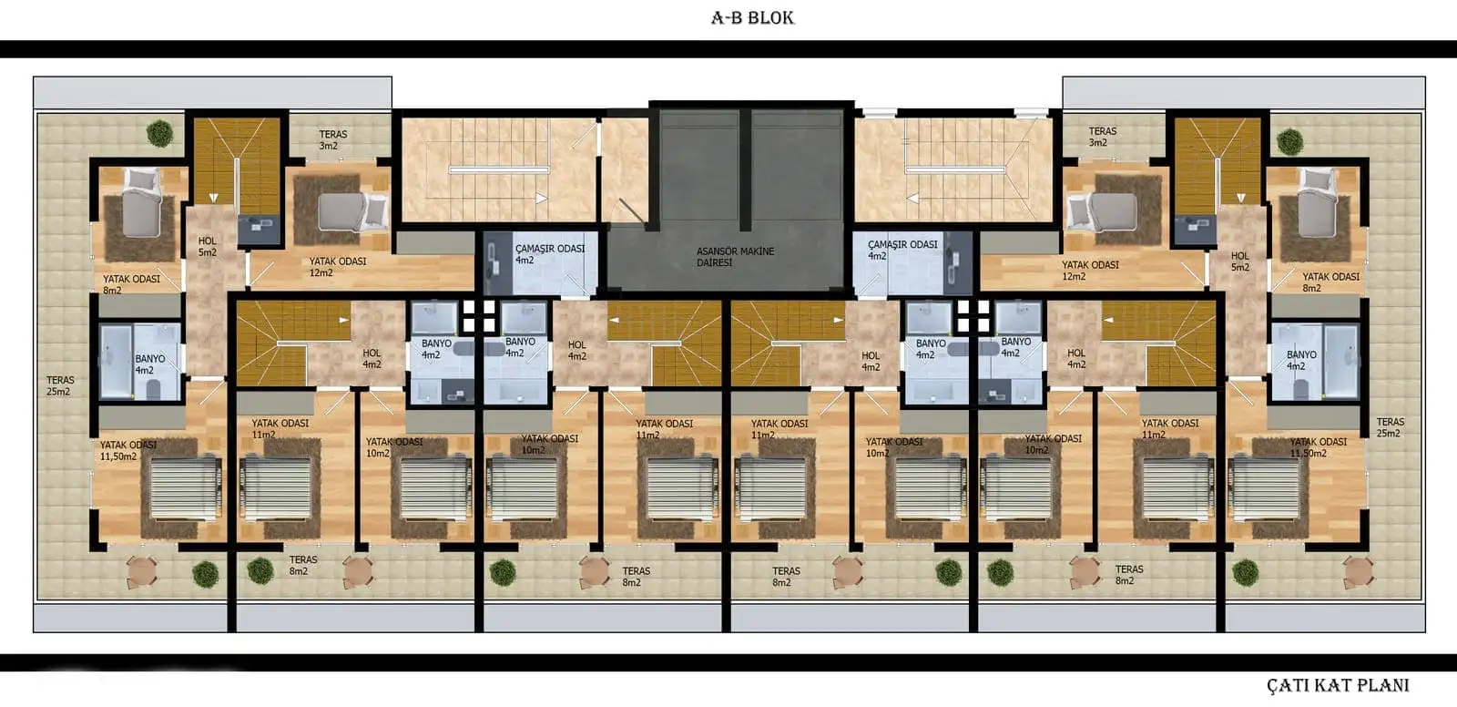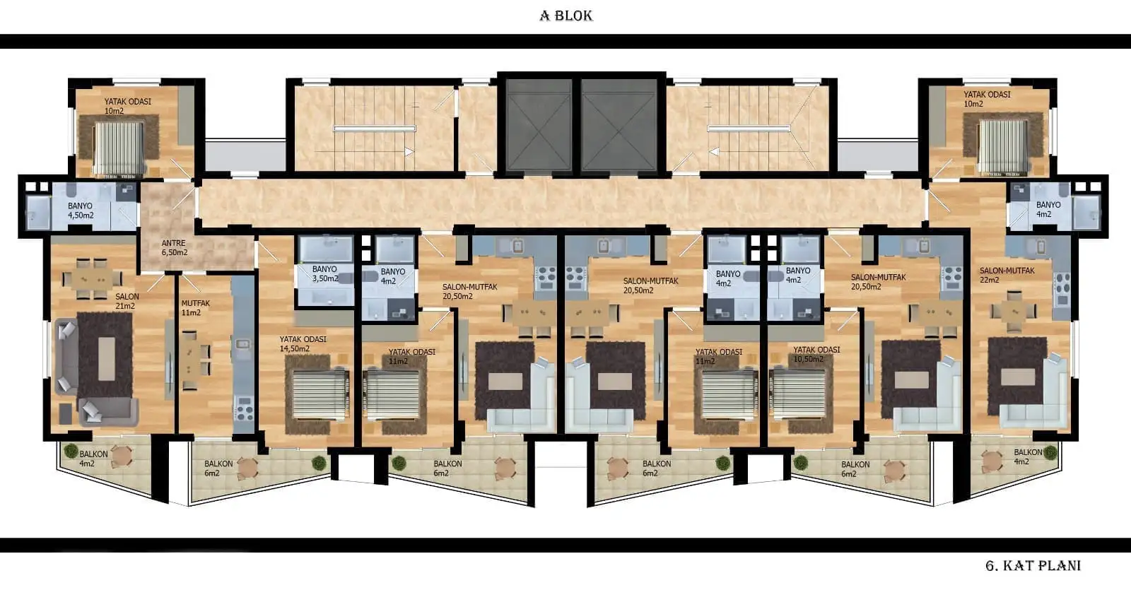 2+1 penthouses with an area of 93 m2 to 99 m2;