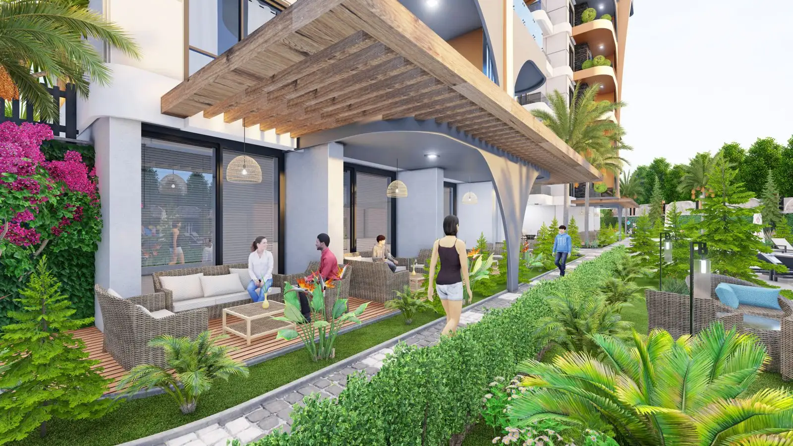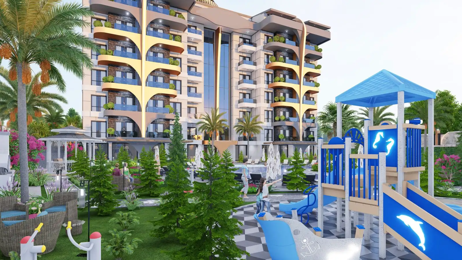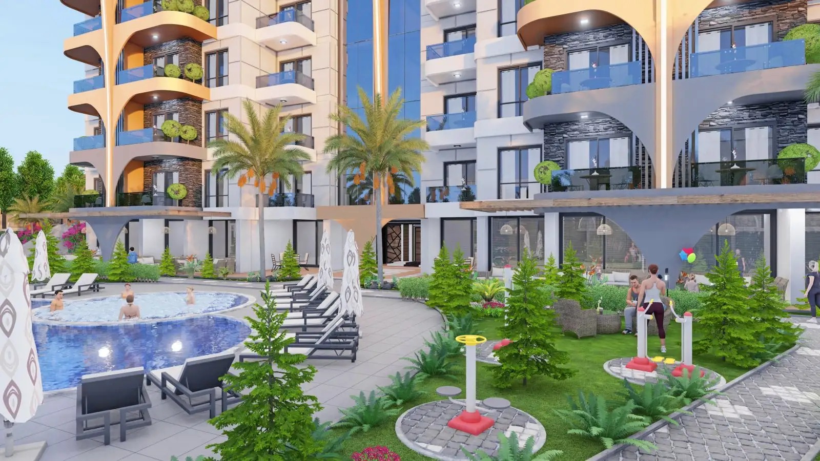 What's in the complex: In a closed area with infrastructure built one of the most beautiful residential projects in Gazipaş, designed in a modern architectural style. The complex will be distinguished by an abundance of places for recreation and a developed internal infrastructure. Guests and residents of the complex will be provided with: an outdoor pool, arbors for recreation, a gym, a sauna, a hamam, a children's playroom, a street sports ground, a cinema, a cafe, a room for games, parking and much more, which will allow you to spend time in the complex with fun and comfort.