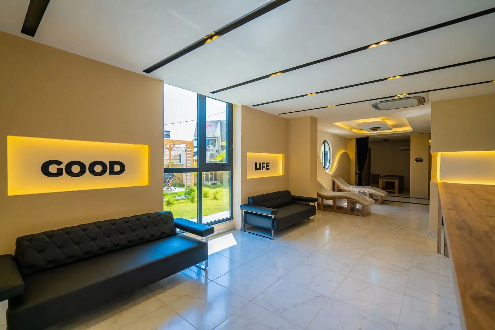 What's in the complex: On the territory of the complex there are two 9-storey, residential blocks, summer pool, indoor pool, hammam, sauna, Roman steam room, recreation area and barbecue, gym, cafe, bar, playground, gazebo for recreation, barbecue, cinema, chess field.
