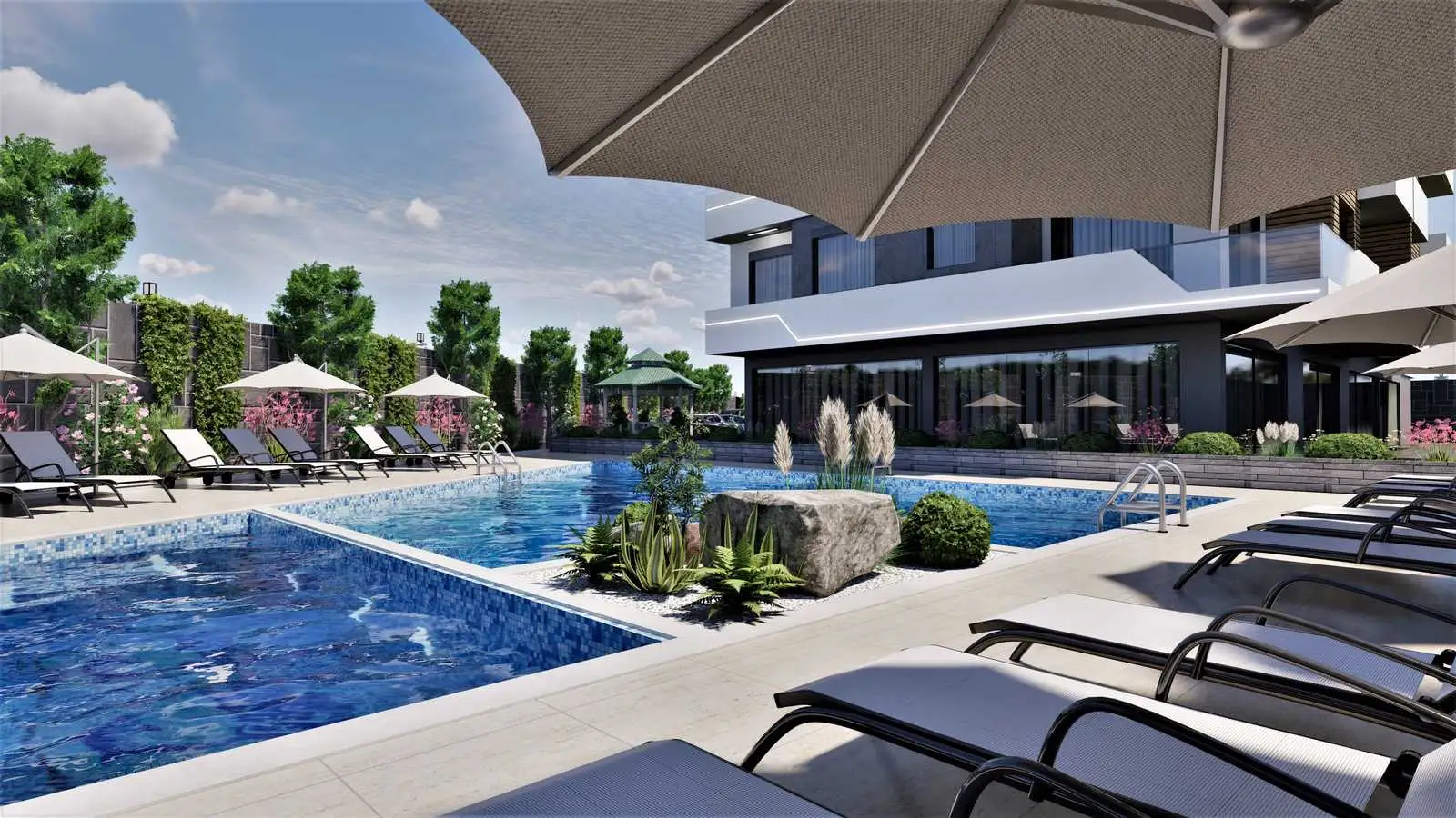 Nearby there is a motorway with developed urban transport, which will allow you to get to any point of Alanya, Antalya and the airport. You can get from the complex to the port and center of Alanya in about 10 minutes by car or public transport. ALANYUM Shopping Center and METRO Hypermarket are just 5 minutes away by car.