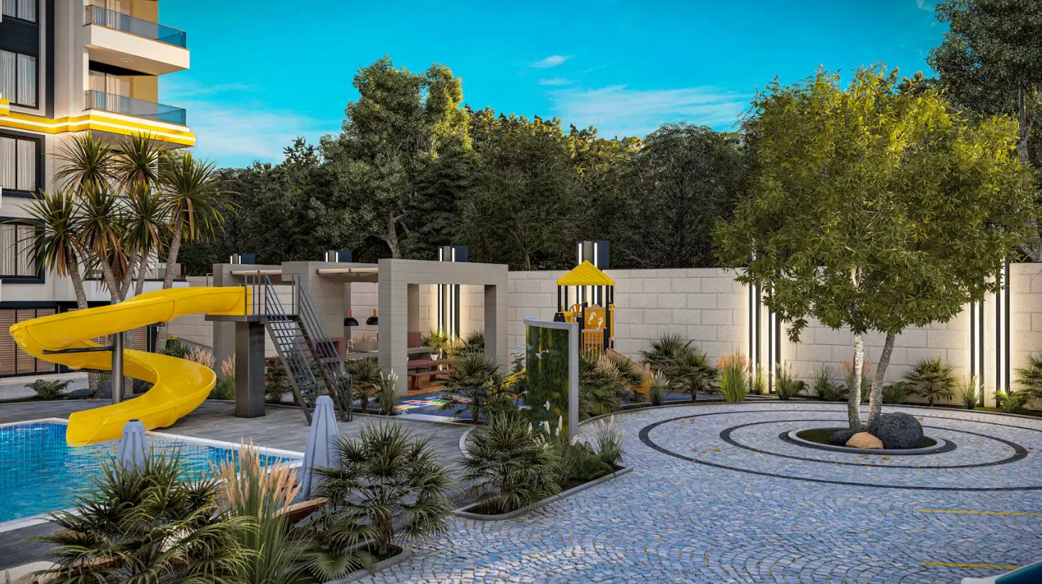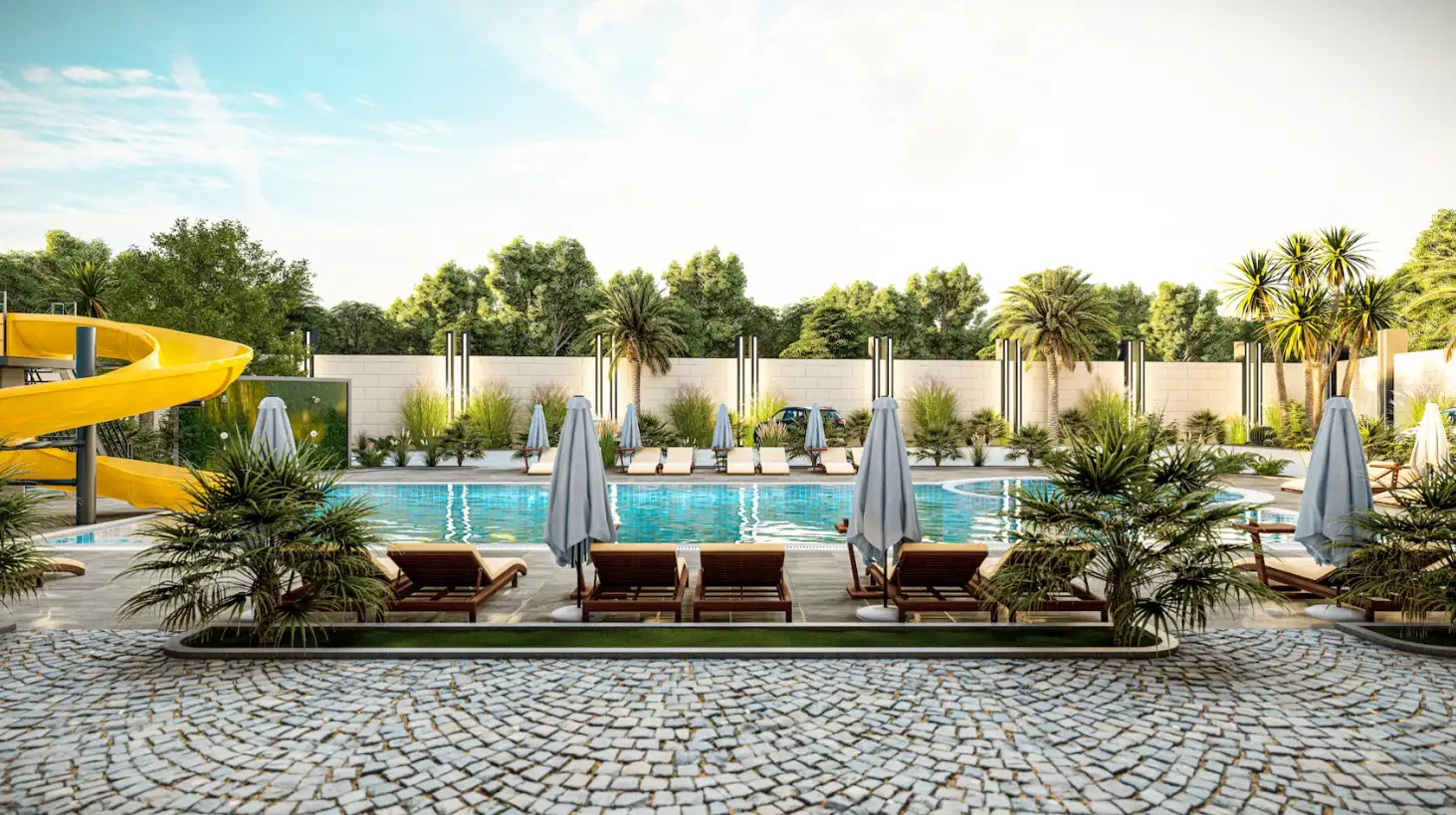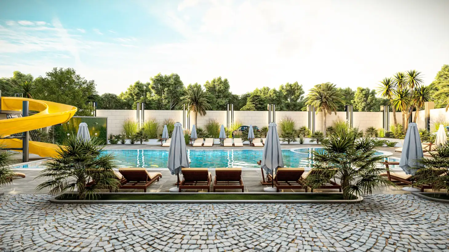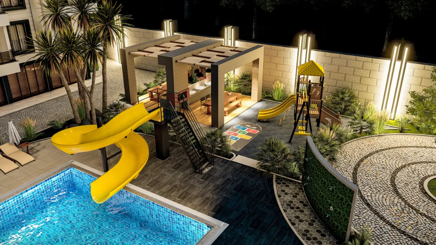 What's in the complex: On a closed, landscaped area of 3,042 m2, there will be one residential block, an outdoor pool with water slides, a children's pool, a recreation area by the pool, a playground, arbors for recreation, a recreation area and a barbecue, a mini club, a Finnish sauna, fitness, open parking, a generator.