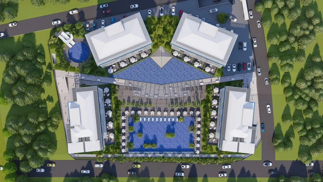 What's in the complex: On a plot of 27.500 m2 there are 4 residential blocks, an outdoor pool, a pool bar, a recreation area and a barbecue, a children's playground, a water park, an outdoor and indoor parking, a heated indoor pool, fitness, sauna, hammam, Roman steam room, salt room, massage rooms, mini club, cinema, bowling, billiards, play station area. For residents of the complex there is an individual beach and a free transfer to it.