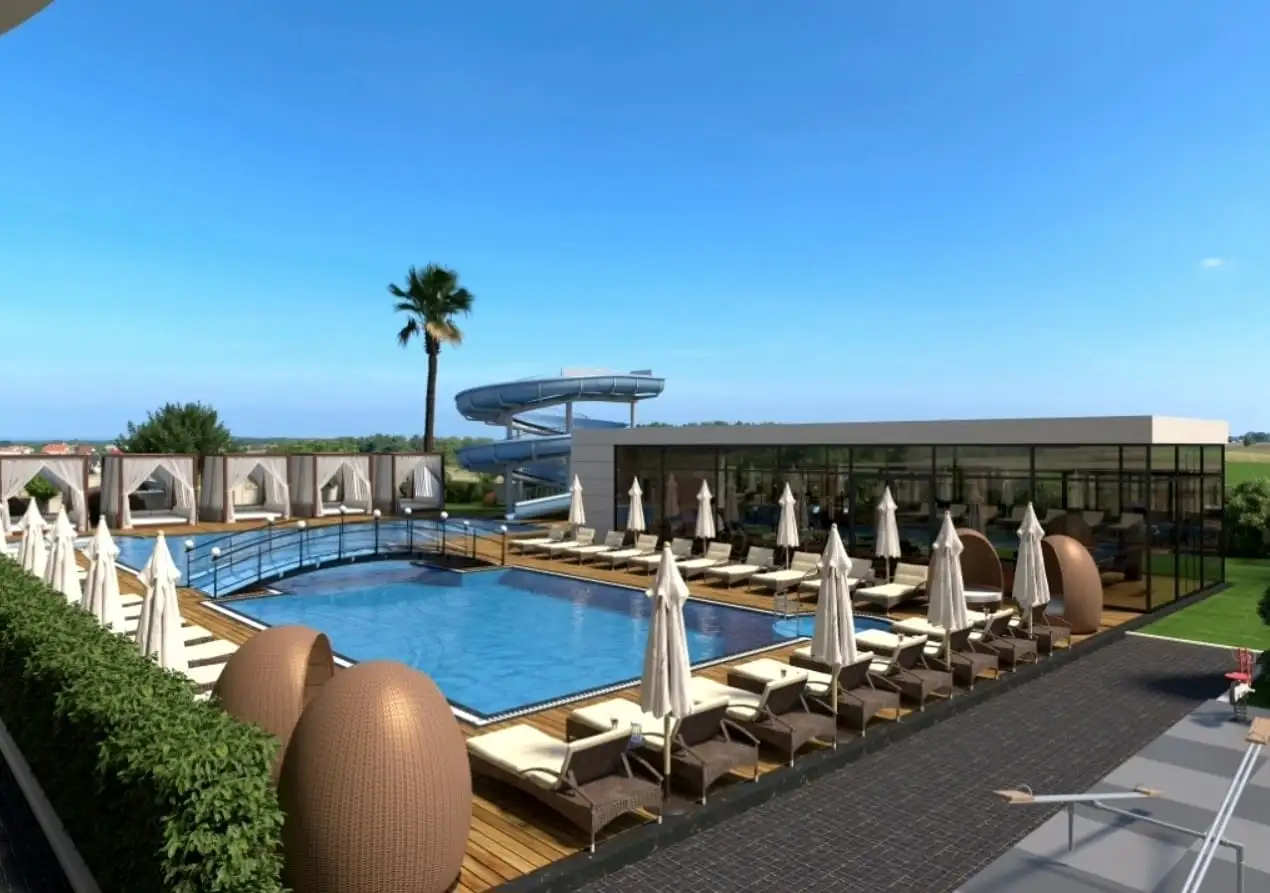 What's in the complex: On the spacious territory of the complex there are two 10 storey, residential blocks, a summer pool, a water park, a barbecue area, arbors for recreation, a playground, an electric generator, a garden, an open parking for cars. The grounds are cared for by a caretaker.