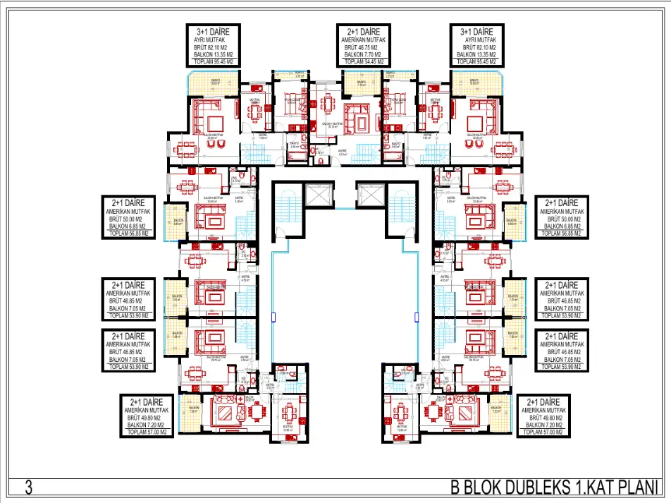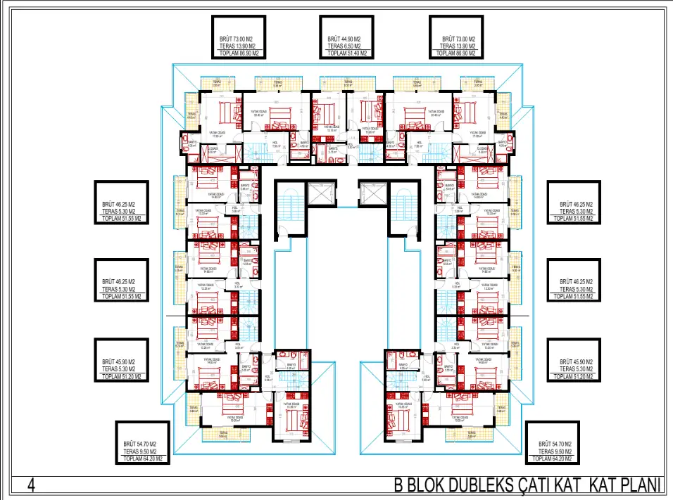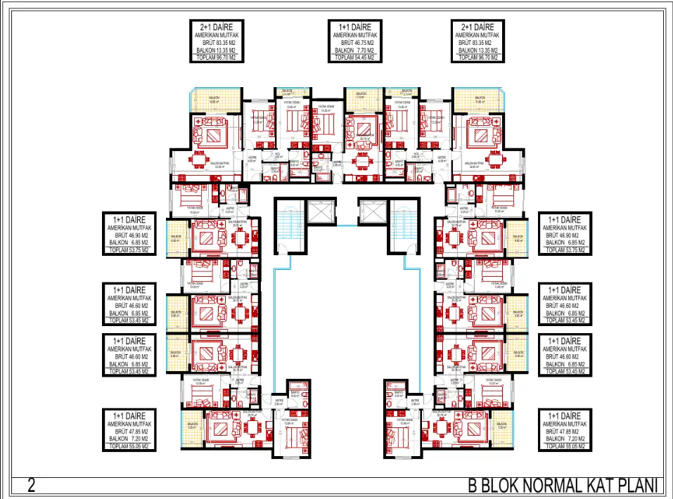 Penthouses 2+1 and 3+1 with an area of 105 and 182 m2, respectively.