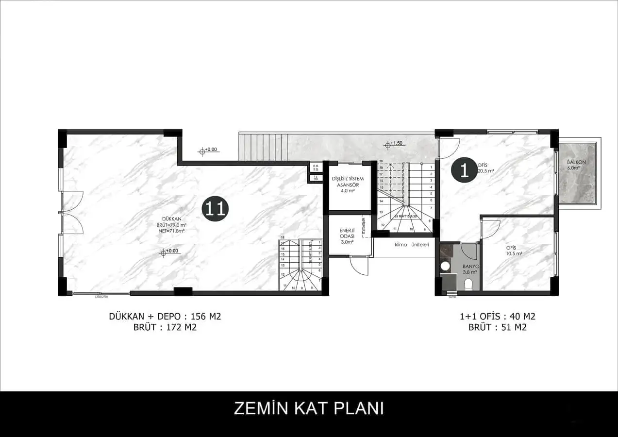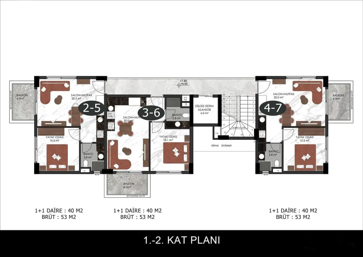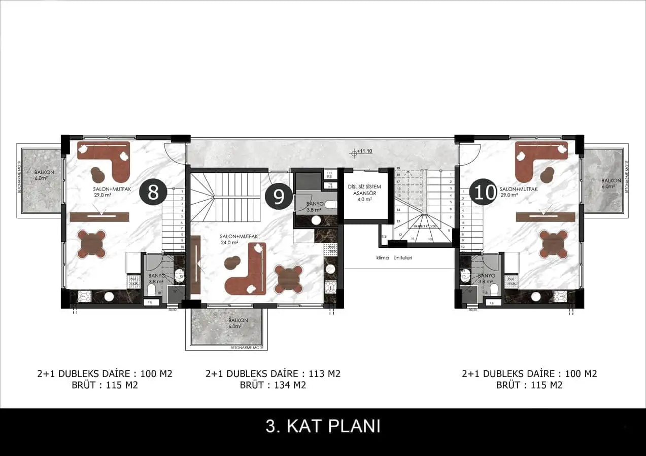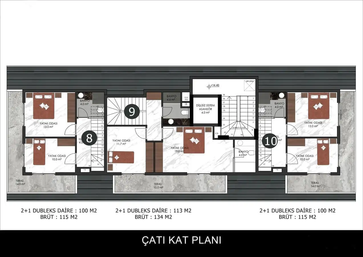 Inside: Available 1+1 apartments with an area of 44 m2 and 2+1 penthouses with an area of 110 m2 and 113 m2.