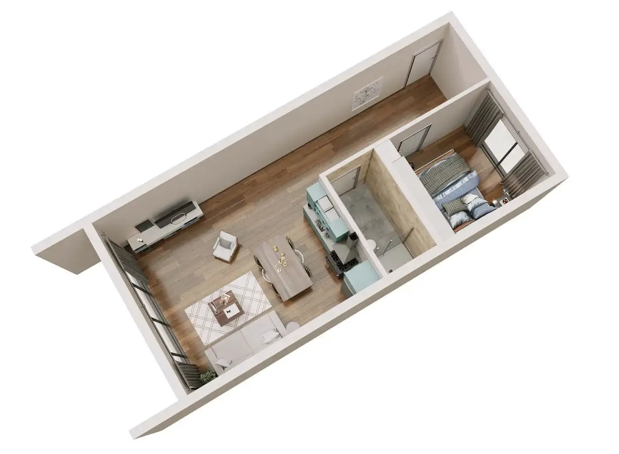 All apartments are delivered with finishing, kitchen set, sanitary ware and finished bathrooms, as well as with the output of communications for the subdivision.