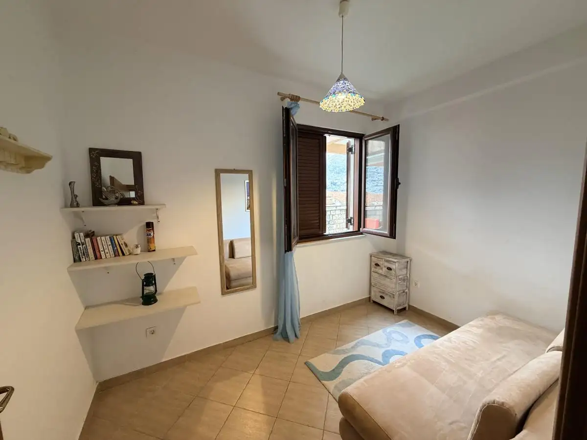 The apartment has its own courtyard, lined with stone, as well as a partial view of the sea.