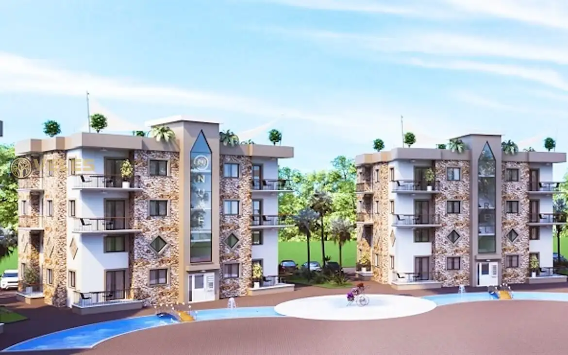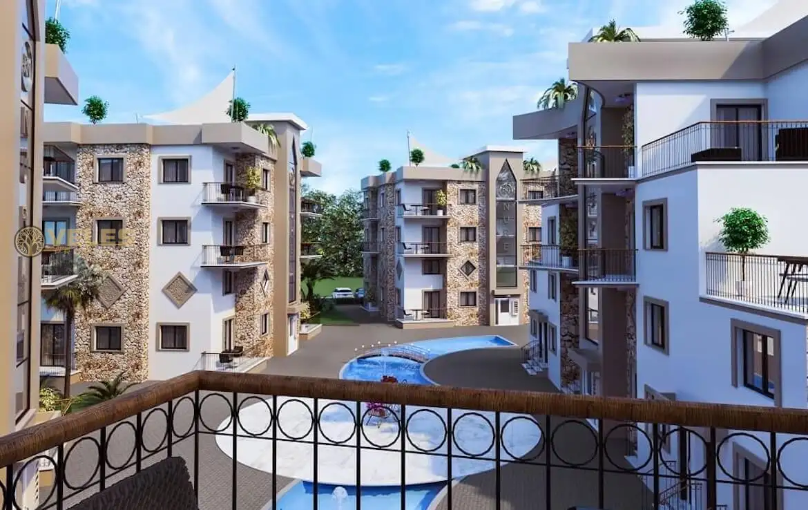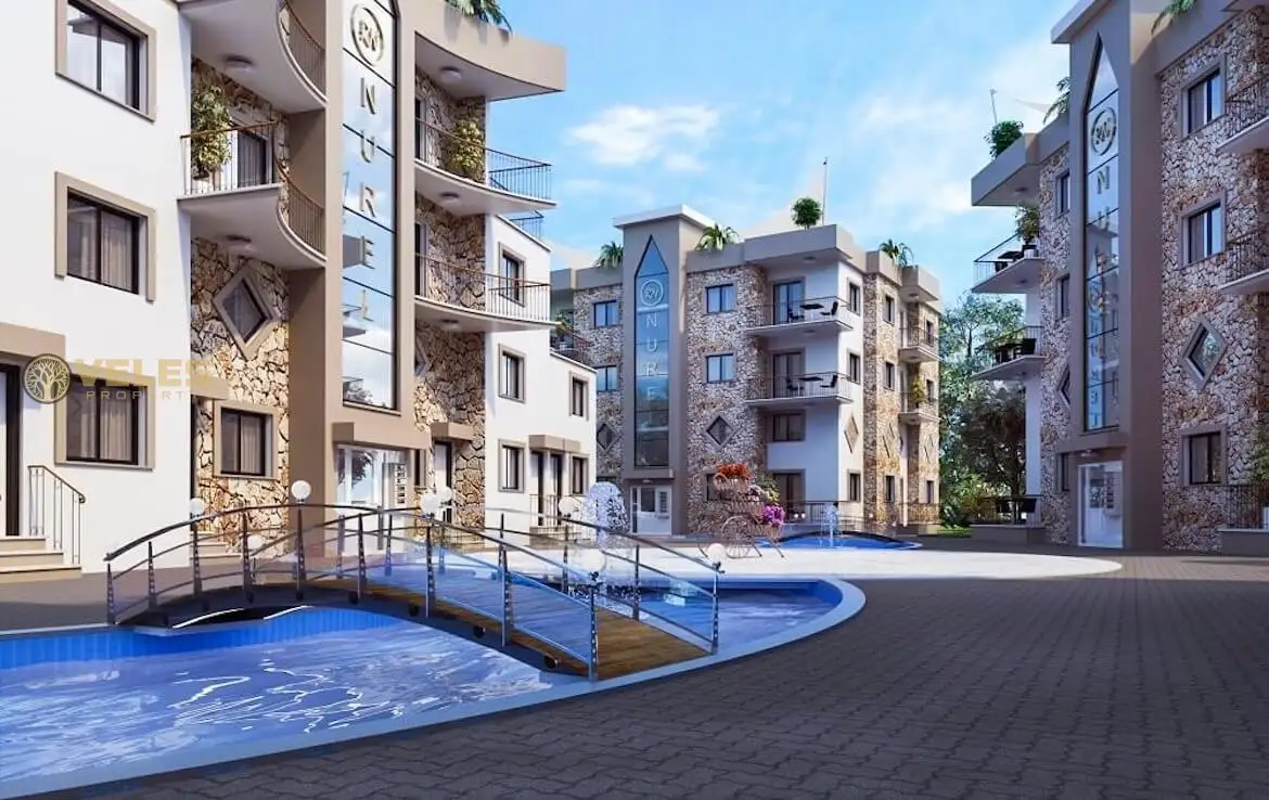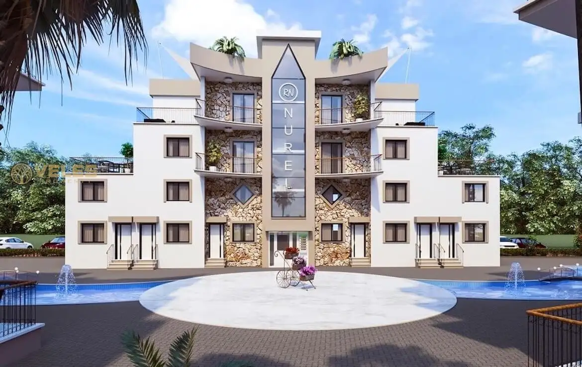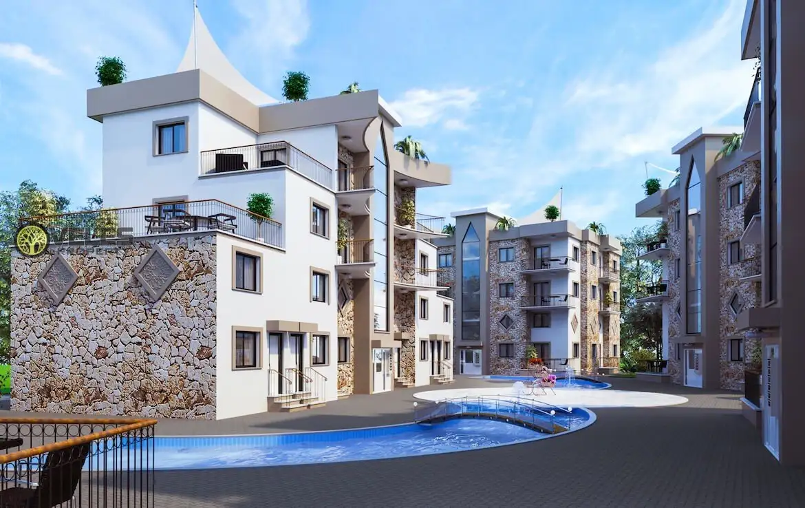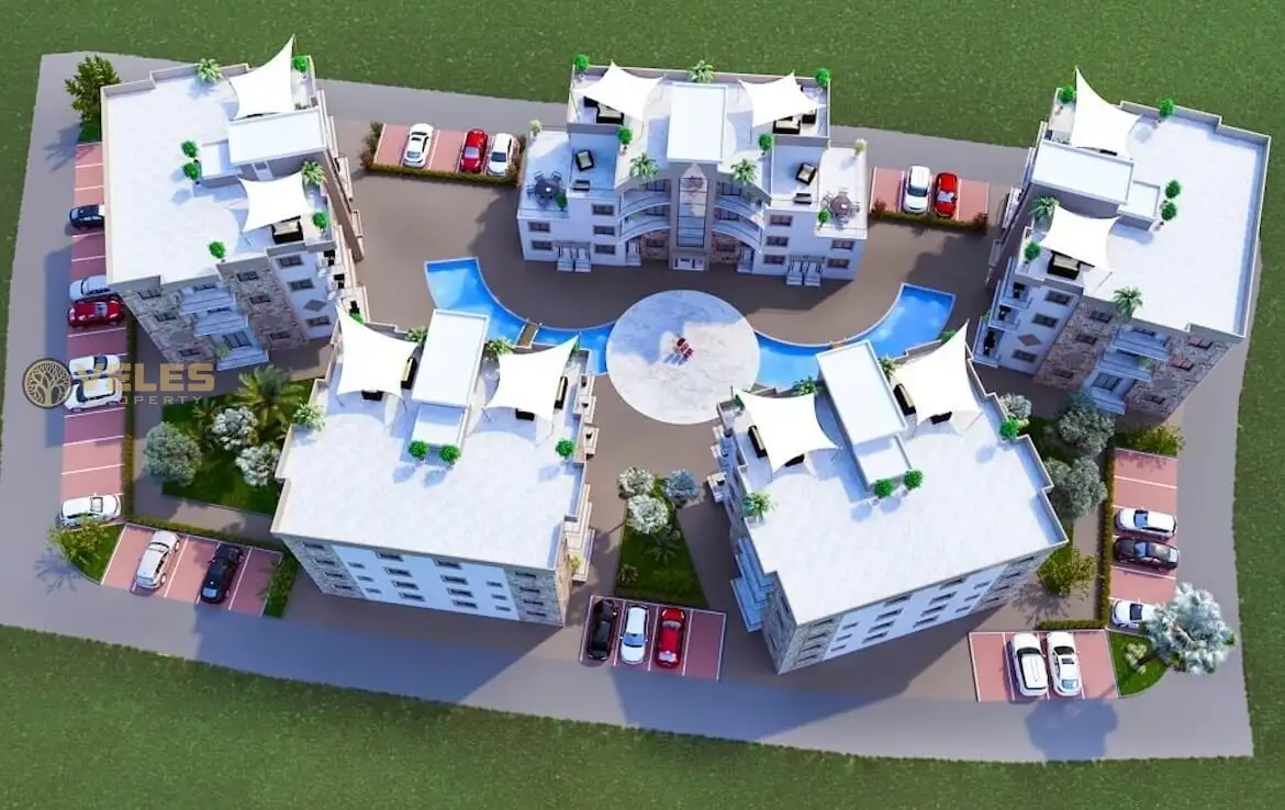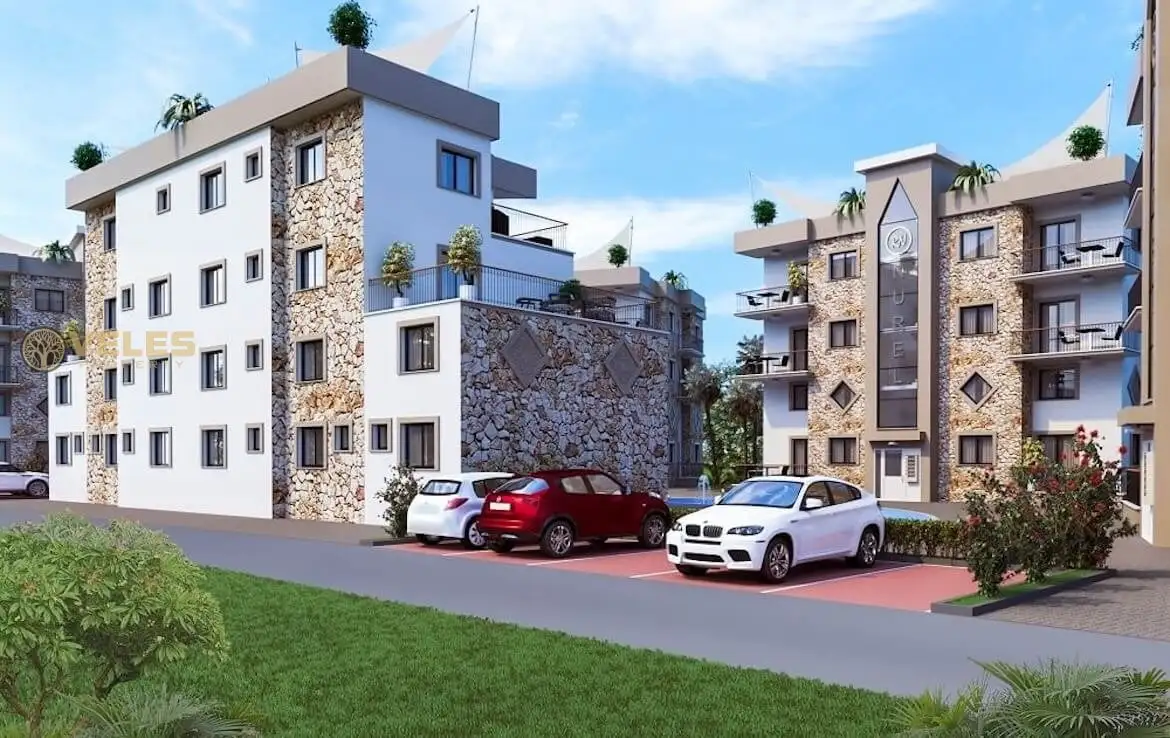 First of all, a few words about the complex itself. This complex is currently under construction and is expected to be completed in April 2021. The construction started in May 2019, and the complex will be built using high-quality materials and modern construction methods. It consists of 8 identical blocks with a pool between them that resembles a river. Additionally, a supermarket, pharmacy, and an English pub are within a two-minute walk. The Necat British College is just a 10-minute drive away, making it ideal for those considering moving to Cyprus for permanent residence.