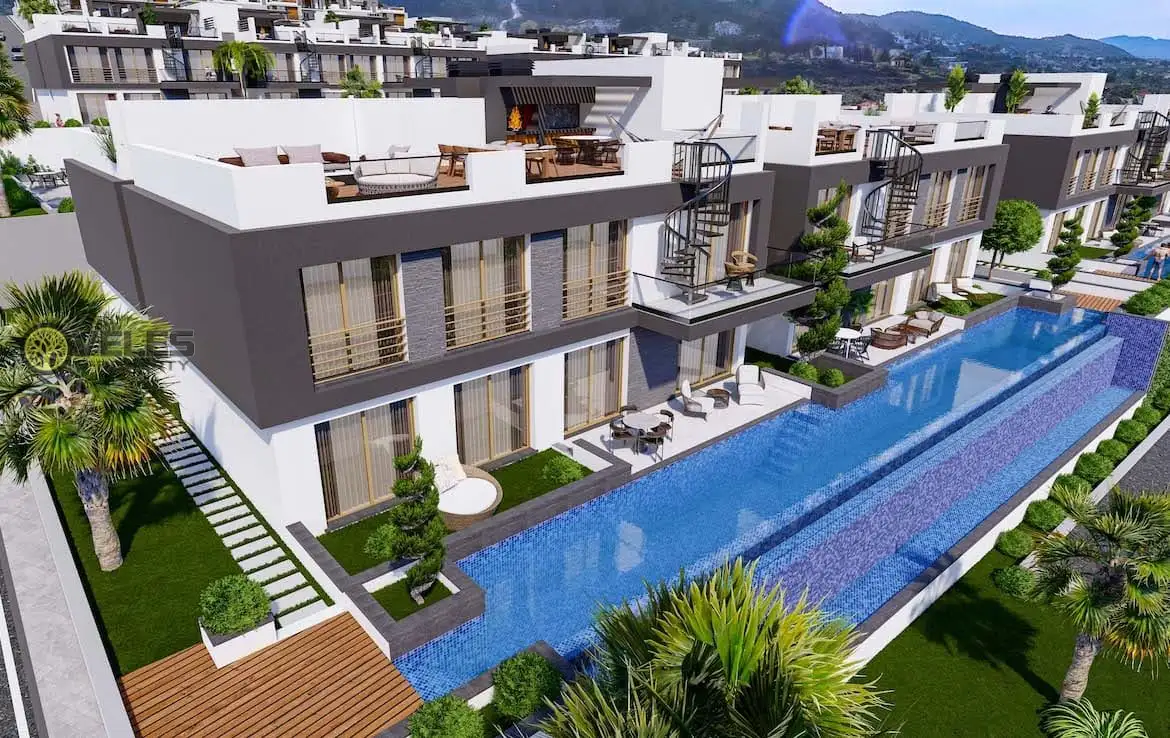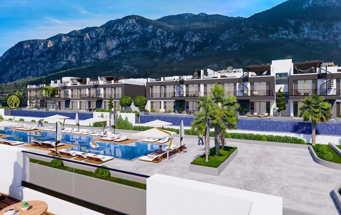 The project is being built in the Lapta region. To the west of the tourist center of Northern Cyprus, Kyrenia. The project consists of 162 luxurious apartments and villas with breathtaking views of the sea and mountains. The project is also located close to famous beaches. So, we offer you extensive infrastructure. This includes a restaurant, cafe, gym, sauna. In addition, there is an indoor pool, outdoor pools, children's pool. Also, there is a mini-market right on the complex grounds.