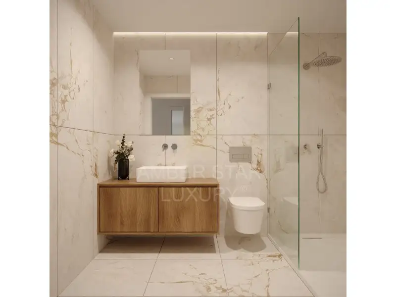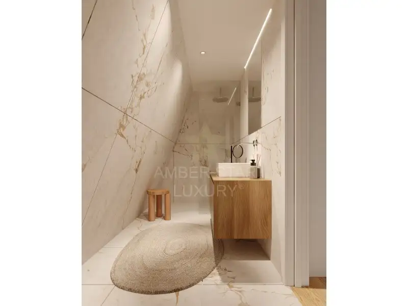 - Bathrooms: white marble in _suite, natural oak in the social bathroom, suspended plumbing;