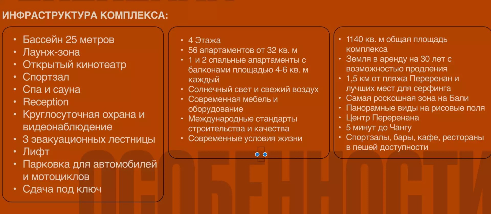 First sales stage. Best price. Maximum profit of the investor. You can earn 50% less than in two years! !!! Limited offer!!! # Type of real estate S msq. Floor Price per sq. Cost 1 SWOI PERERANAN 1 bedroom apartment 31 1 $3,548 $110,000 Exit 1. Transaction Indicator Apartment Redesigned The cost of finished real estate at market prices for mid-2023 $ 180,000 Amount of investment $ 110,000 Net profit $ 61000 ROI% 55.45 Exit 2. Rent Business Indicator Apartment Redesigned Average daily rental rate of $ 124 Occupancy, % 75 Gross Income, $ 34,085 Utilities payments 15% 5 112 Commission 20% 6,817 Income tax 10% 2,215 Net profit 19,941 ROI / return on investment 18.12% 5.5 years Interaction Payment plan: Reservation Deposit $2,000 / Signing of an Agreement of Intent / Legal Review Period (up to 15 days) First payment 5 days after signing contracts - 50% minus $2,000 deposit Subsequent payments according to the agreed schedule according to your wishes, for example 5 payments of 10% every three months.