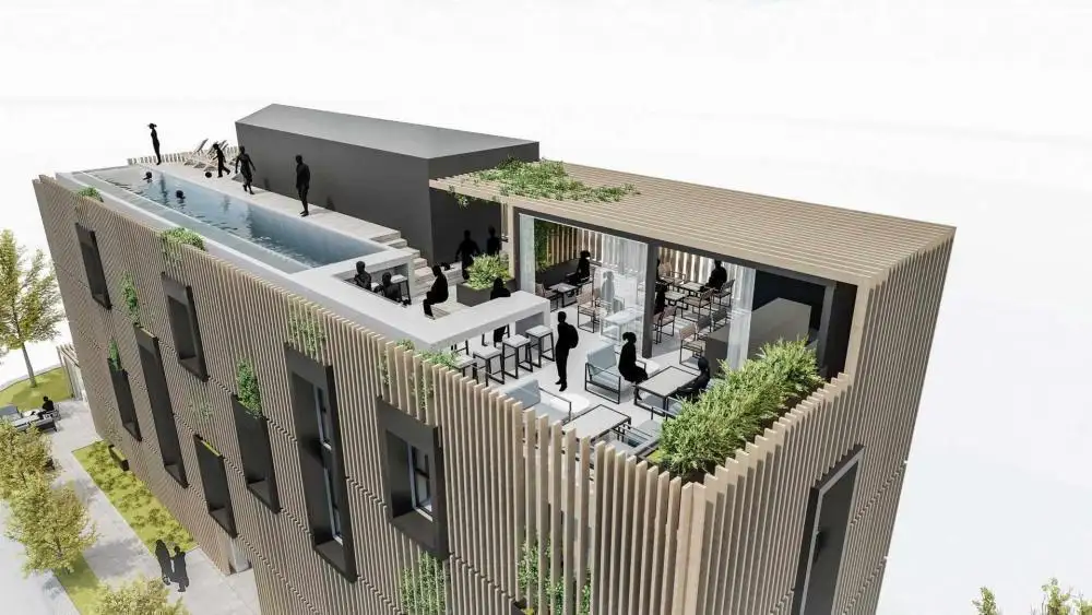 The approved project includes a total of 22 rooms, including 14 hotel rooms, 6 studio apartments and 2 large apartments, complemented by a reception area, a recreation area and a multifunctional space on the first floor. One of the key points of the concept is an exceptionally attractive roof with a bar, a recreation area and a swimming pool about 20 meters long. Designed as a modern rooftop space with panoramic views, this solution represents a unique and innovative concept for the Rijeka market, offering clear commercial potential and strong differentiation in the urban and premium short-term accommodation segment.