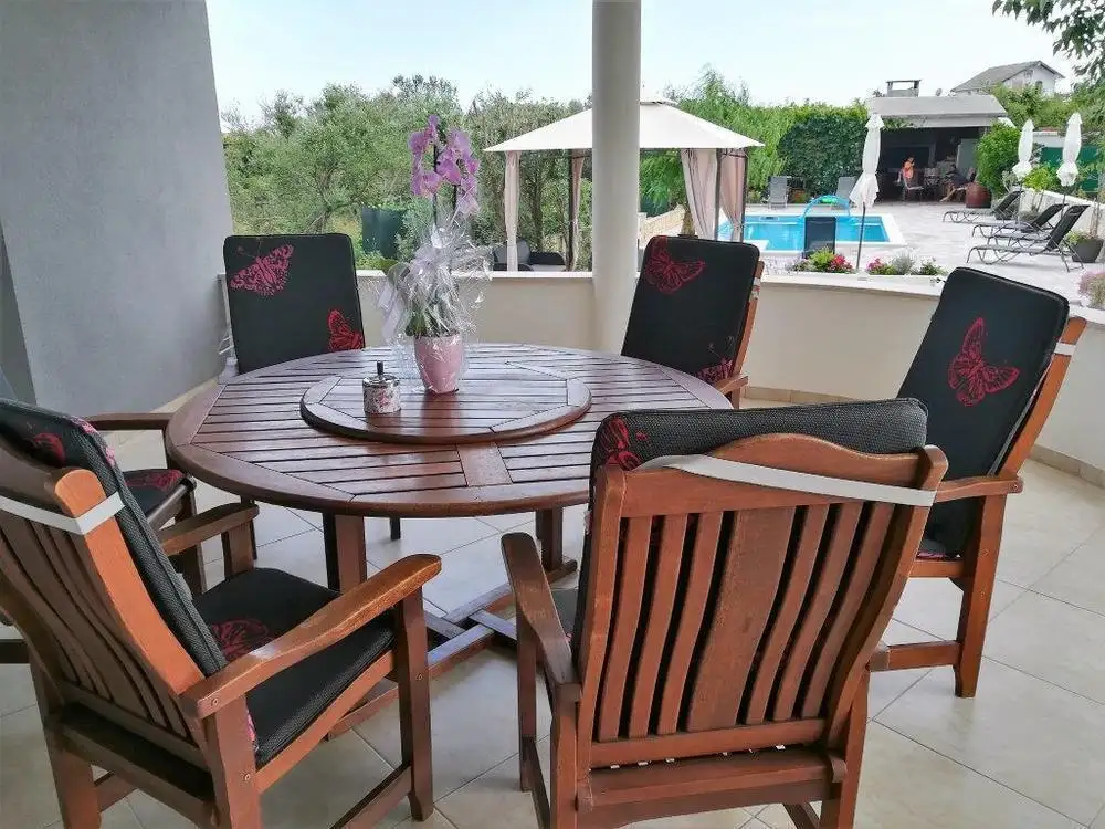 The land plot is 1000 sqm. There is a large parking lot, a well maintained yard with swimming pool and a covered summer kitchen with a large stone fireplace in Mediterranean style.