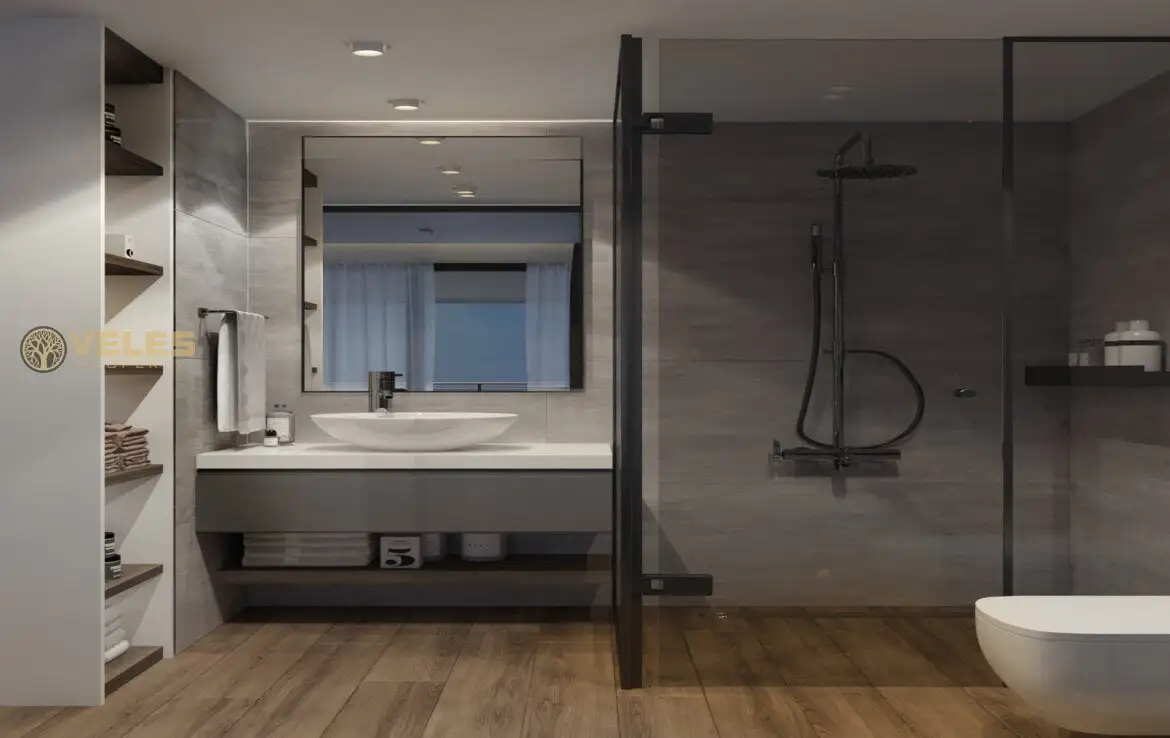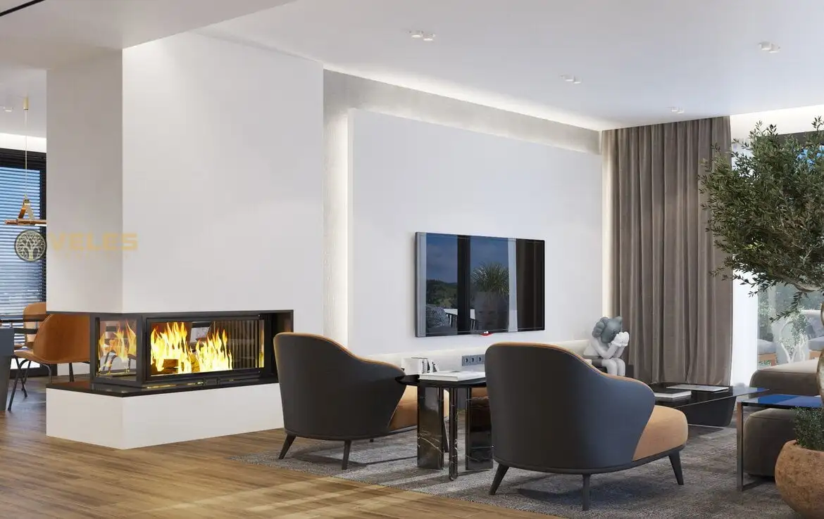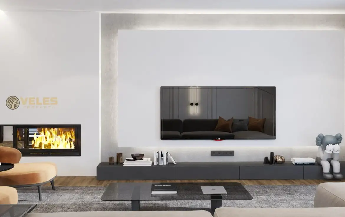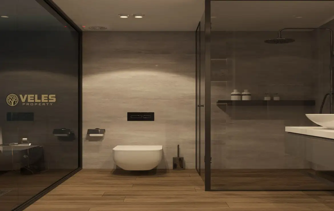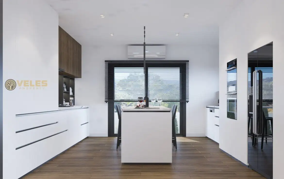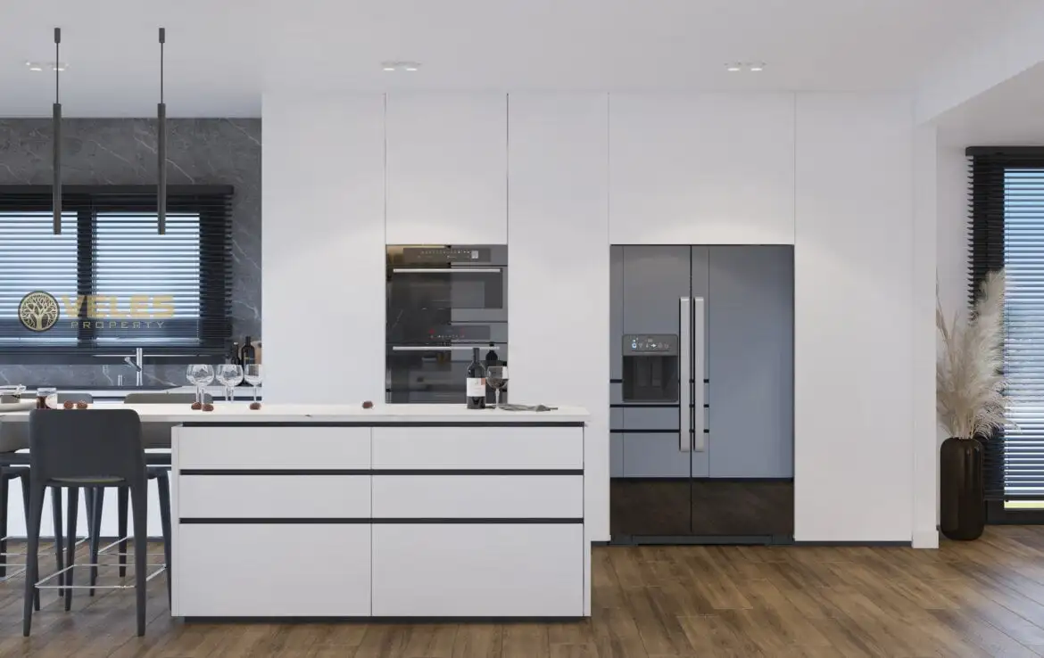The villa has 5 terraces, including two well-kept garden patios, two balconies, and a roof terrace with a built-in barbecue and a foundation for a jacuzzi, offering stunning views. Each bedroom is equipped with its own bathroom with a shower cabin. The villas are also equipped with four air conditioners, a kitchen with quartz countertops, and fitted wardrobes.