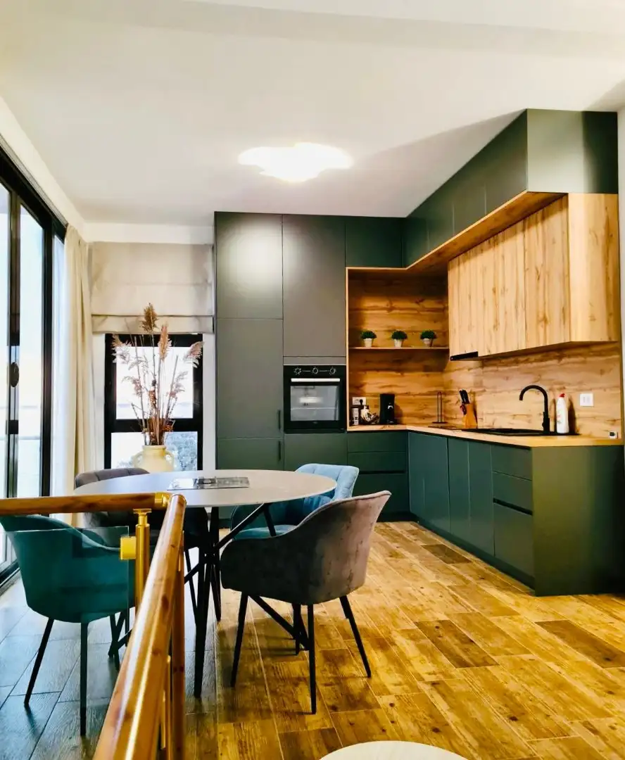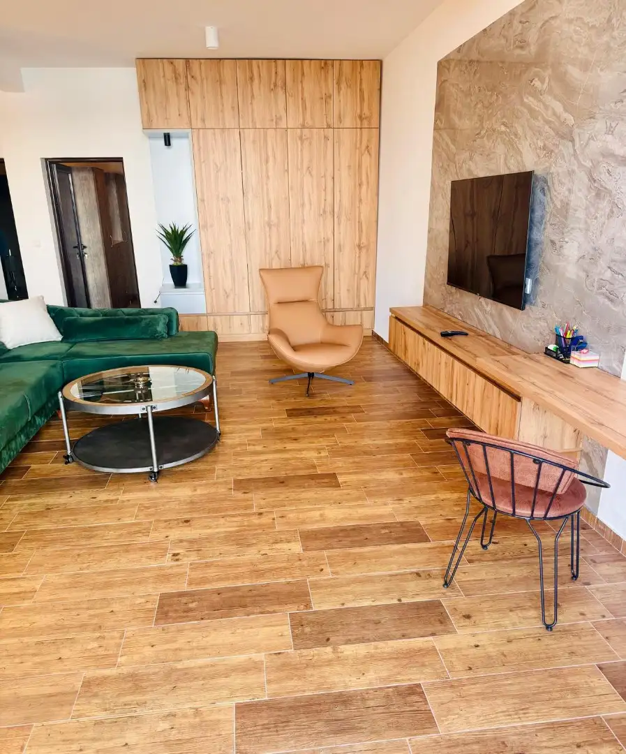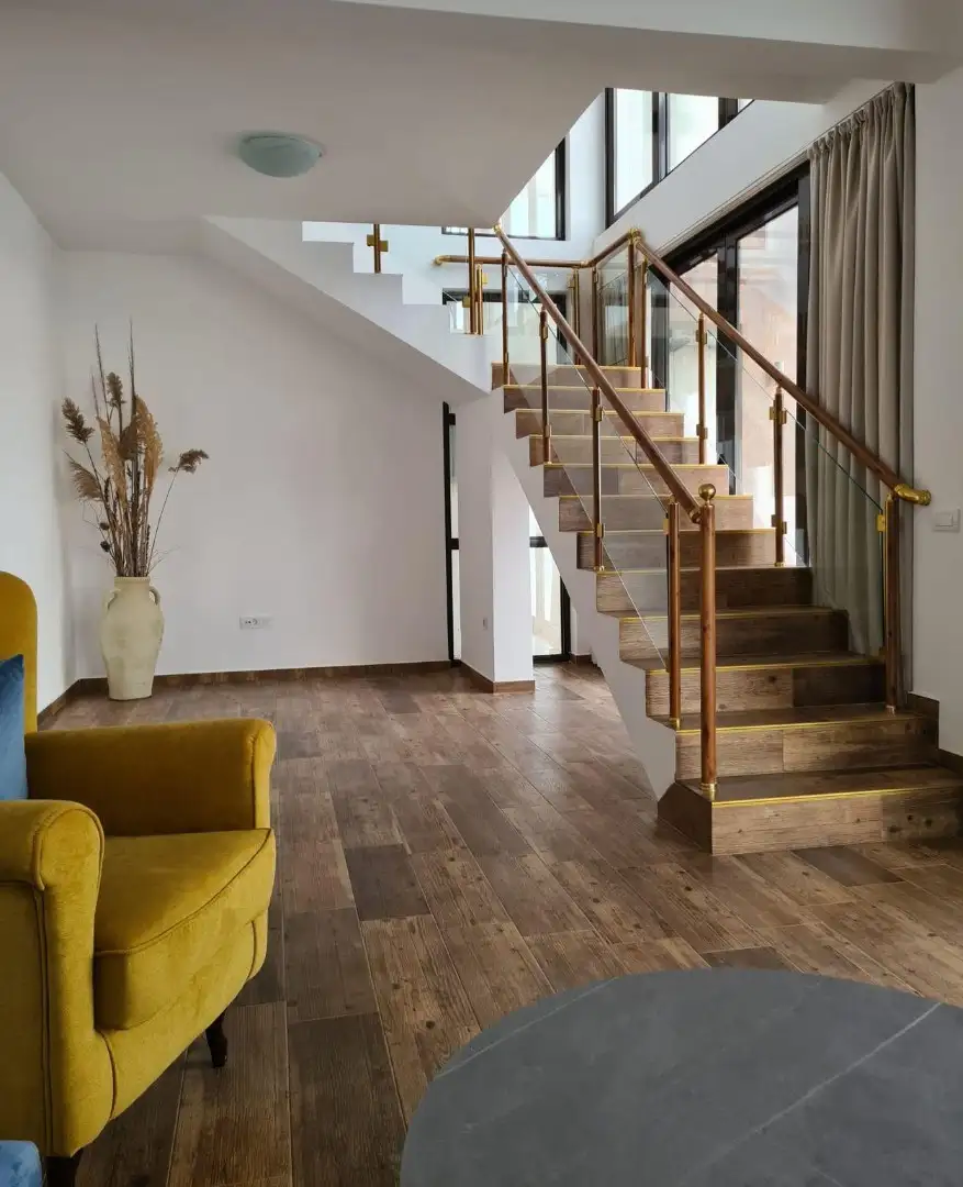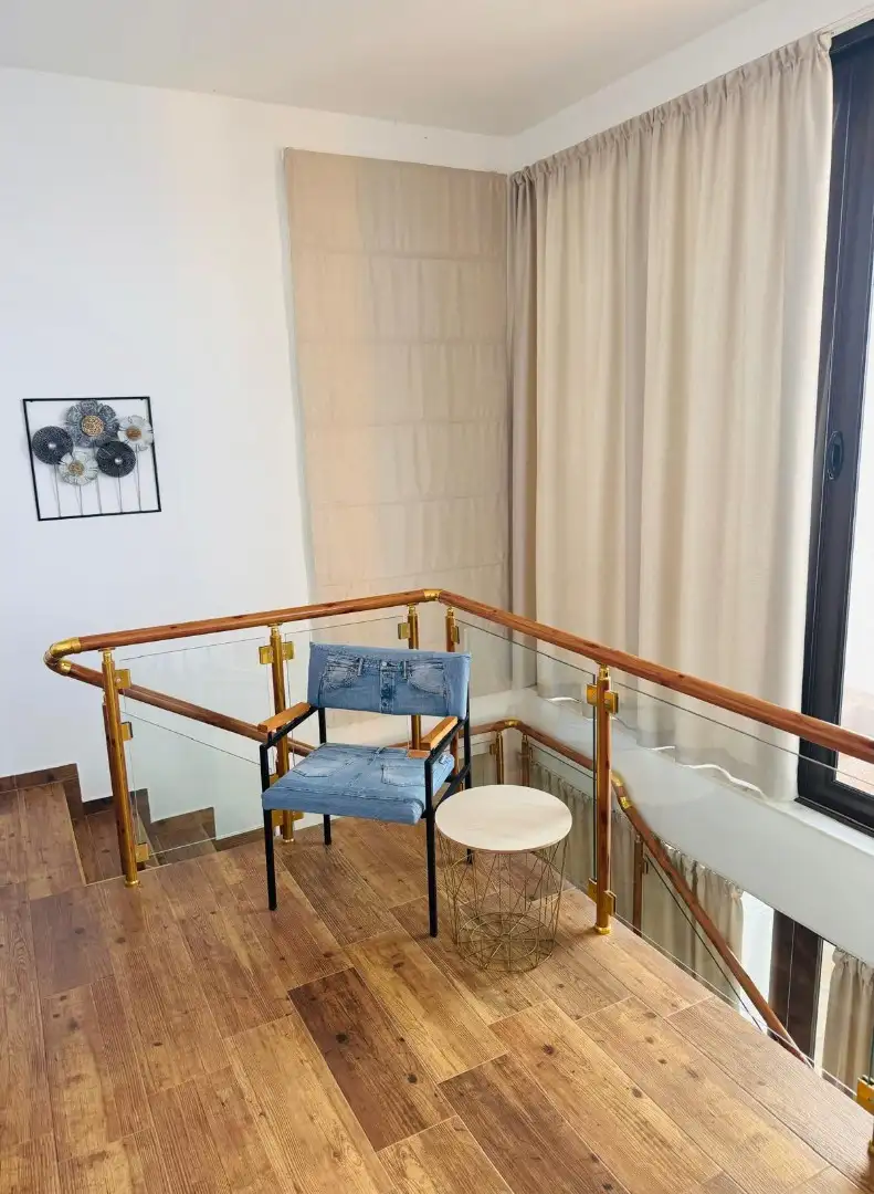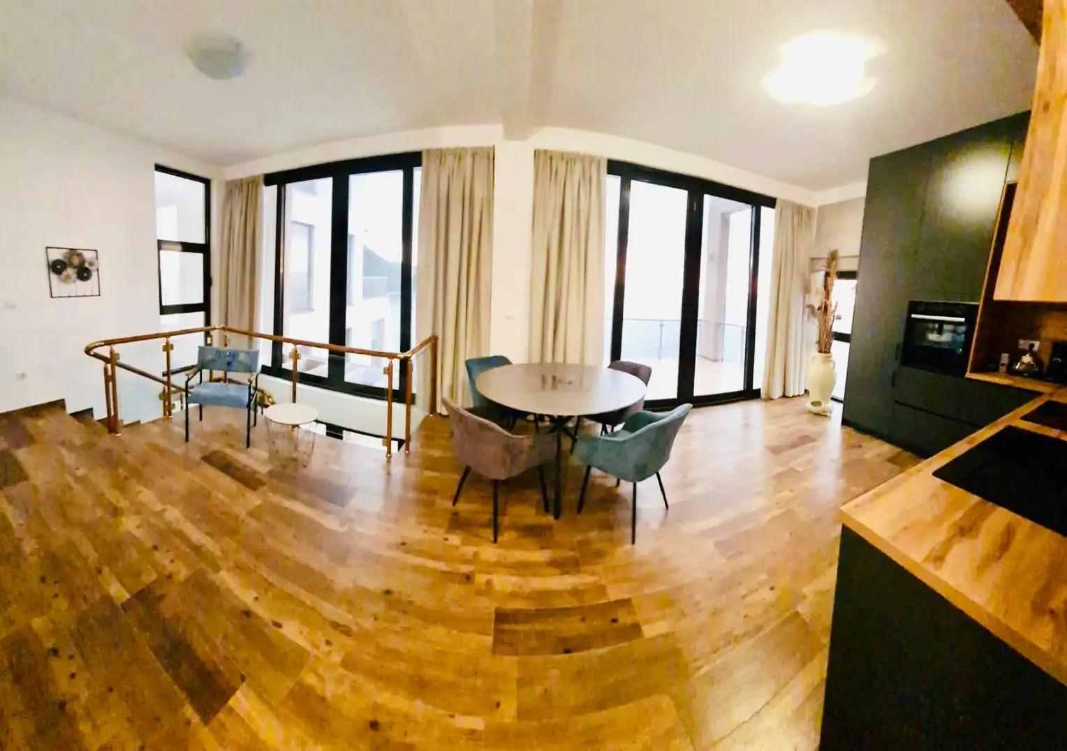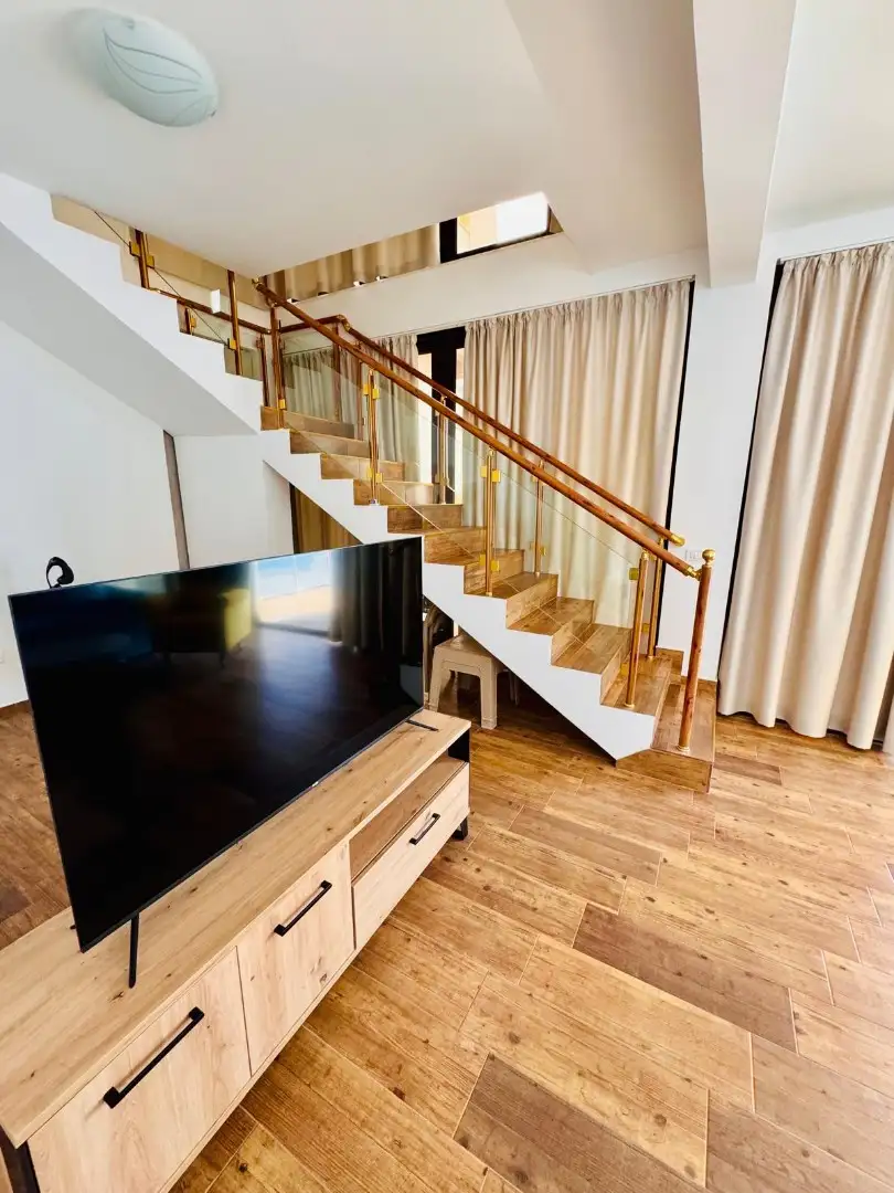 The lower duplex consists of a spacious living room, a kitchen with a dining room, two bedrooms, two bathrooms and two terraces.