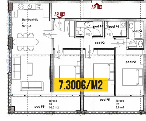 Modern penthouse on the top floor with two terraces, a spacious kitchen-living room and three bedrooms.