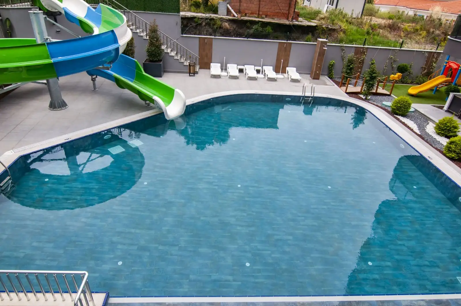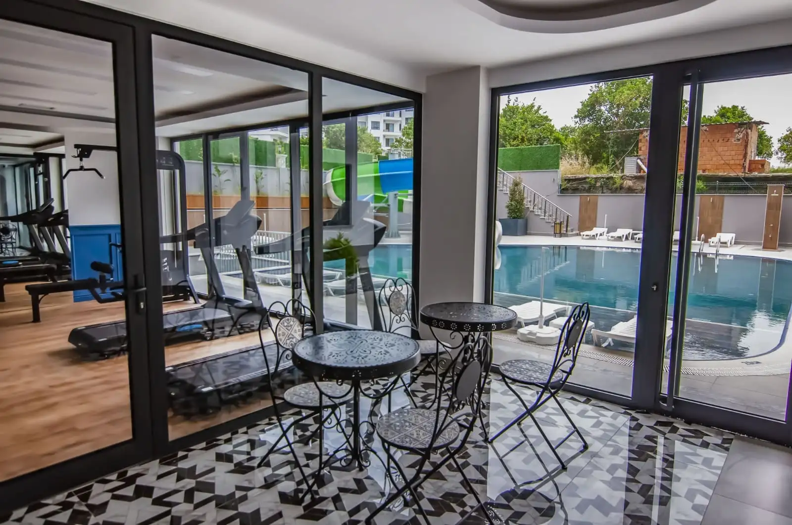 What's in the complex: On the cozy territory of the complex there is a 10-storey block, outdoor pool, water park, indoor pool, Finnish sauna, Roman steam room, salt room, table tennis, billiards, sports hall, conference hall, open parking, cinema, hammam, game room, security, generator.