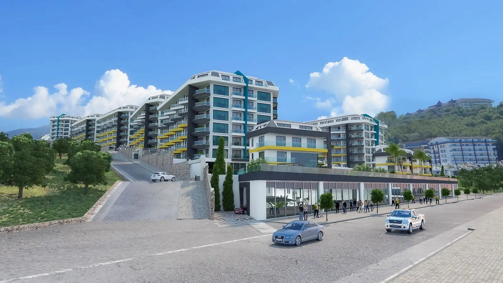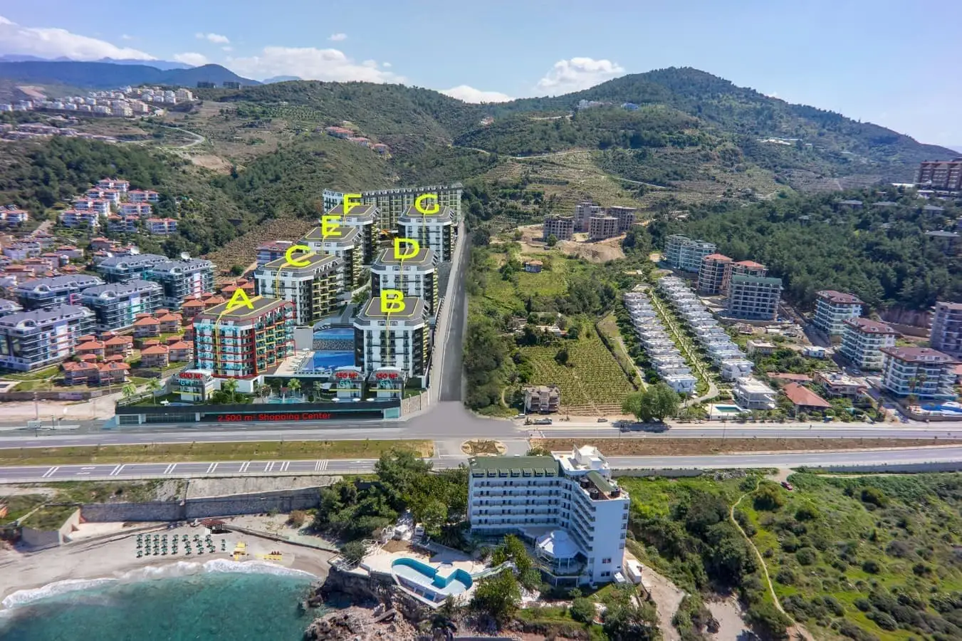 What's next? The complex is located on the first coastline; 50 meters from the complex there is a beautiful promenade, seaside restaurants, clean, pebble beaches, and closer to the center of the district there are shops, pharmacies, Migros supermarket, grocery market, sports grounds, bus stops, neighboring, large Mahmutlar district, with all the necessary infrastructure.