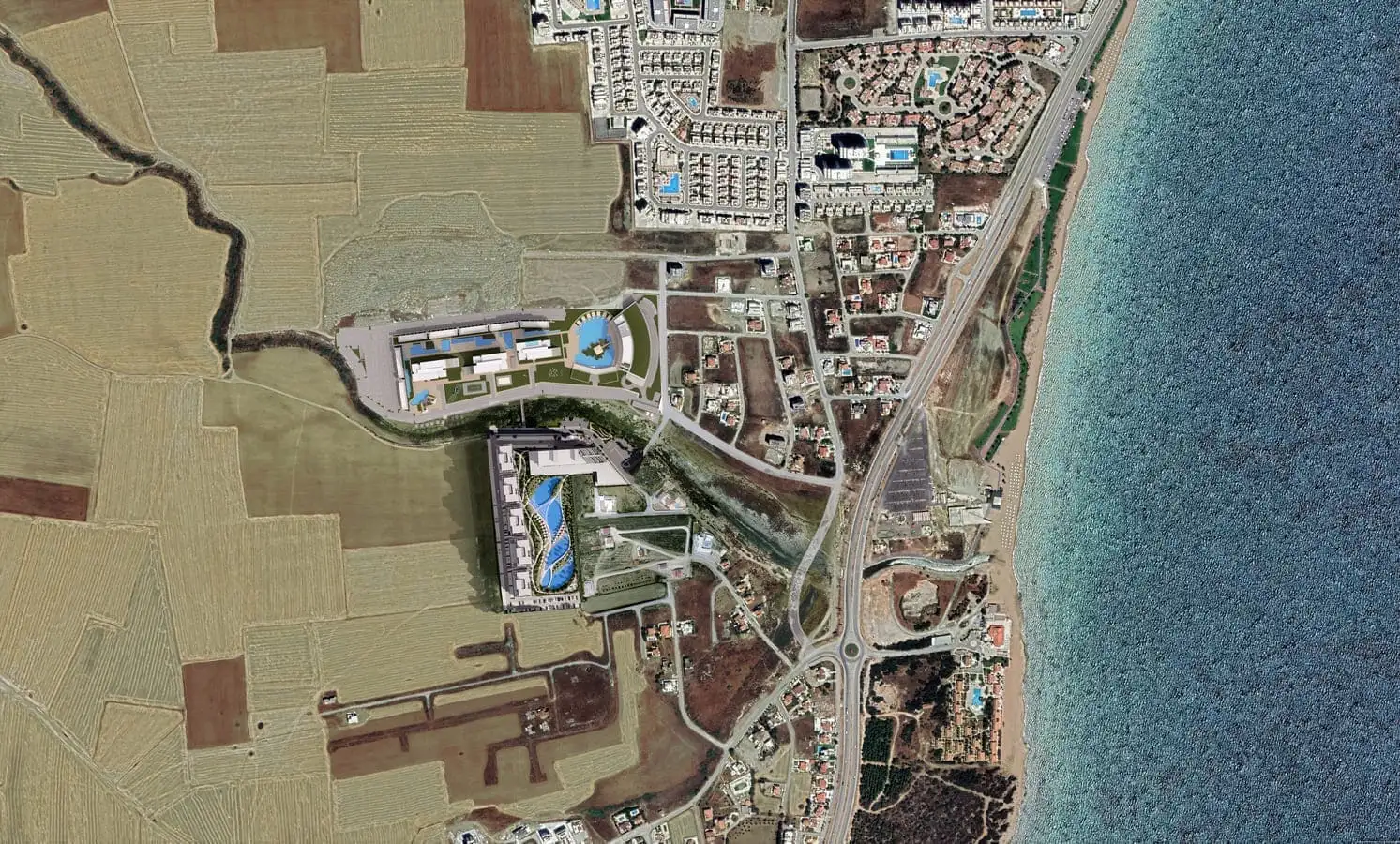 The complex will be located near the area of Long Beach, with its 3 km long sandy coastline and crystal clear water of the Mediterranean Sea. On the promenade there are areas with lawns, palm trees, additional passages to the beach, located children's playgrounds installed fitness equipment.What's nearby: The complex will be located 500 meters from the sea, and just a few minutes drive from the towns of Famagusta, Bogaza and the ancient city of Salamis, among many historical sites.What's in the complex: On the closed territory of the complex with landscaping will be located many outdoor pools, restaurant, SPA - center, fitness, outdoor parking.