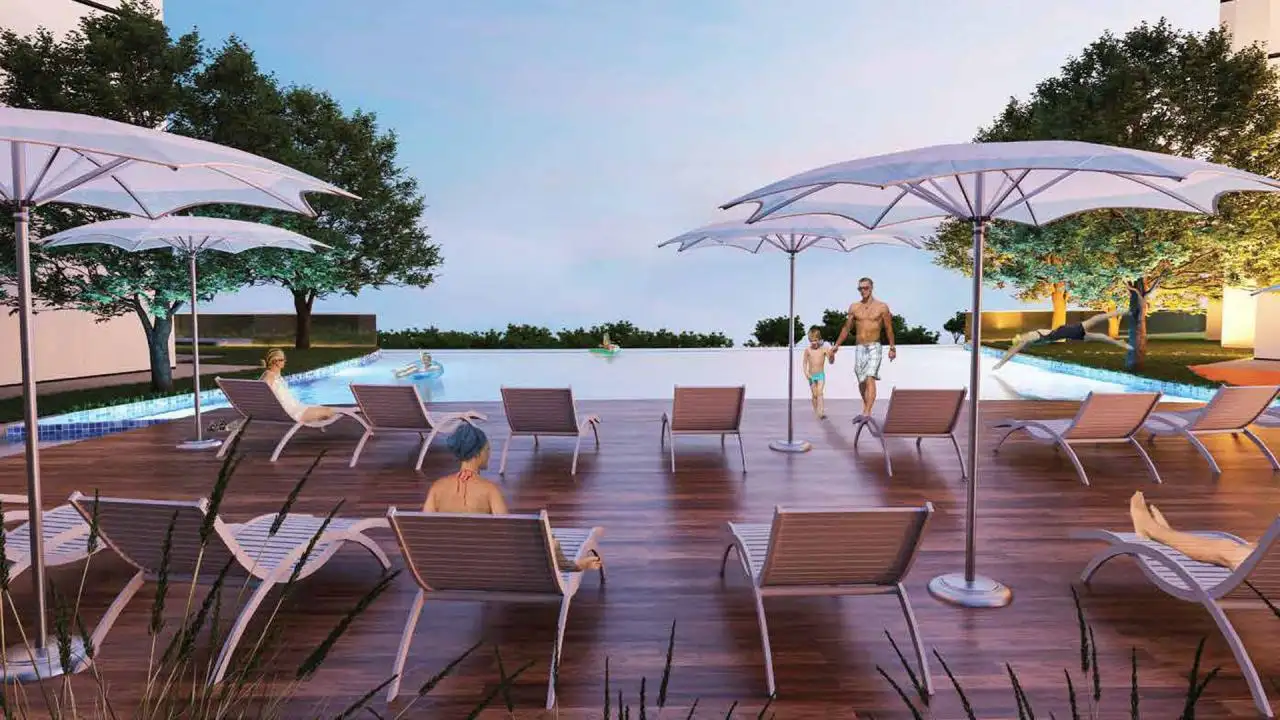 Amenities: open pool with water relaxation area, landscaped gardens, relaxation areas surrounded by trees on an open podium, children's playgrounds, fitness rooms, basketball court, shops.
