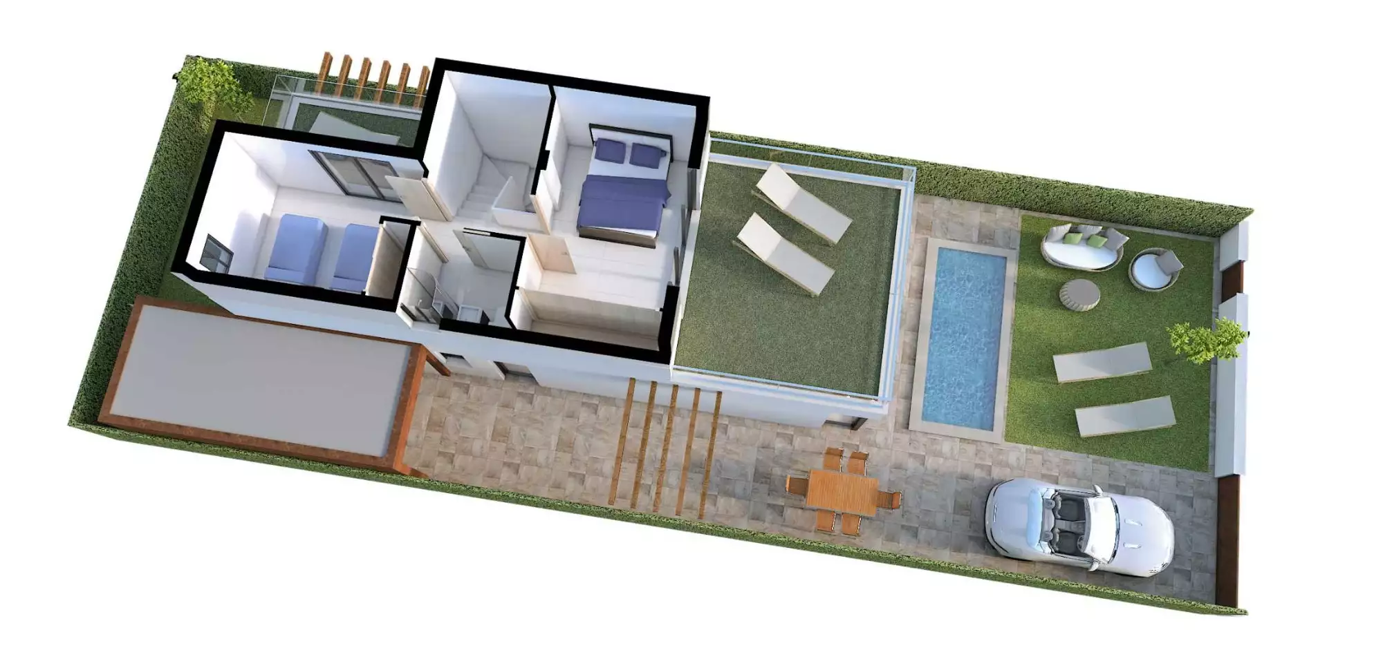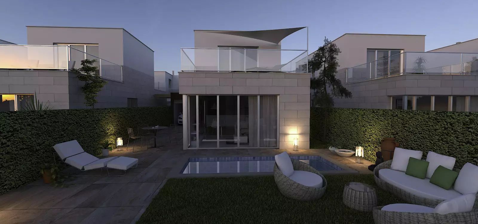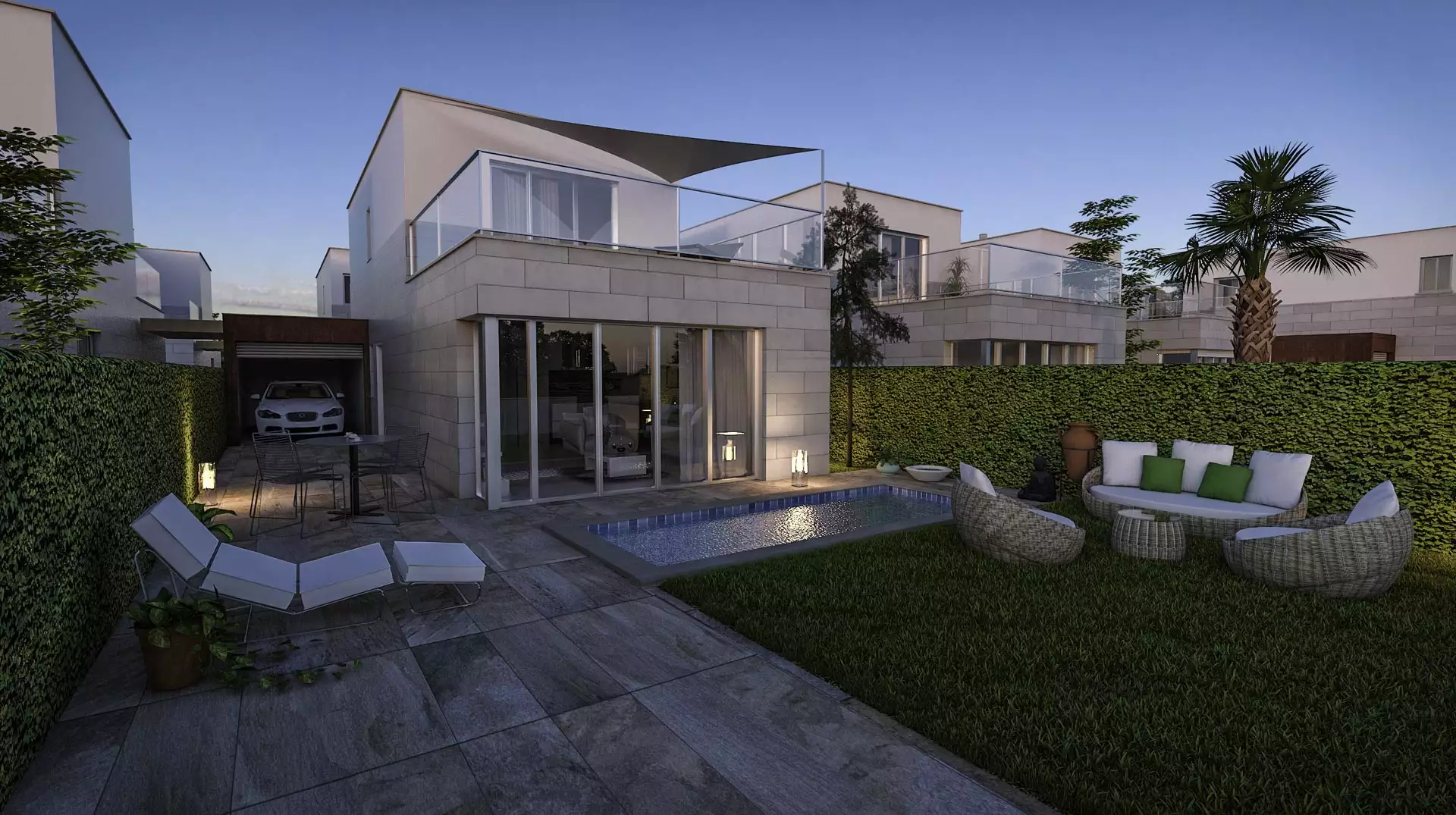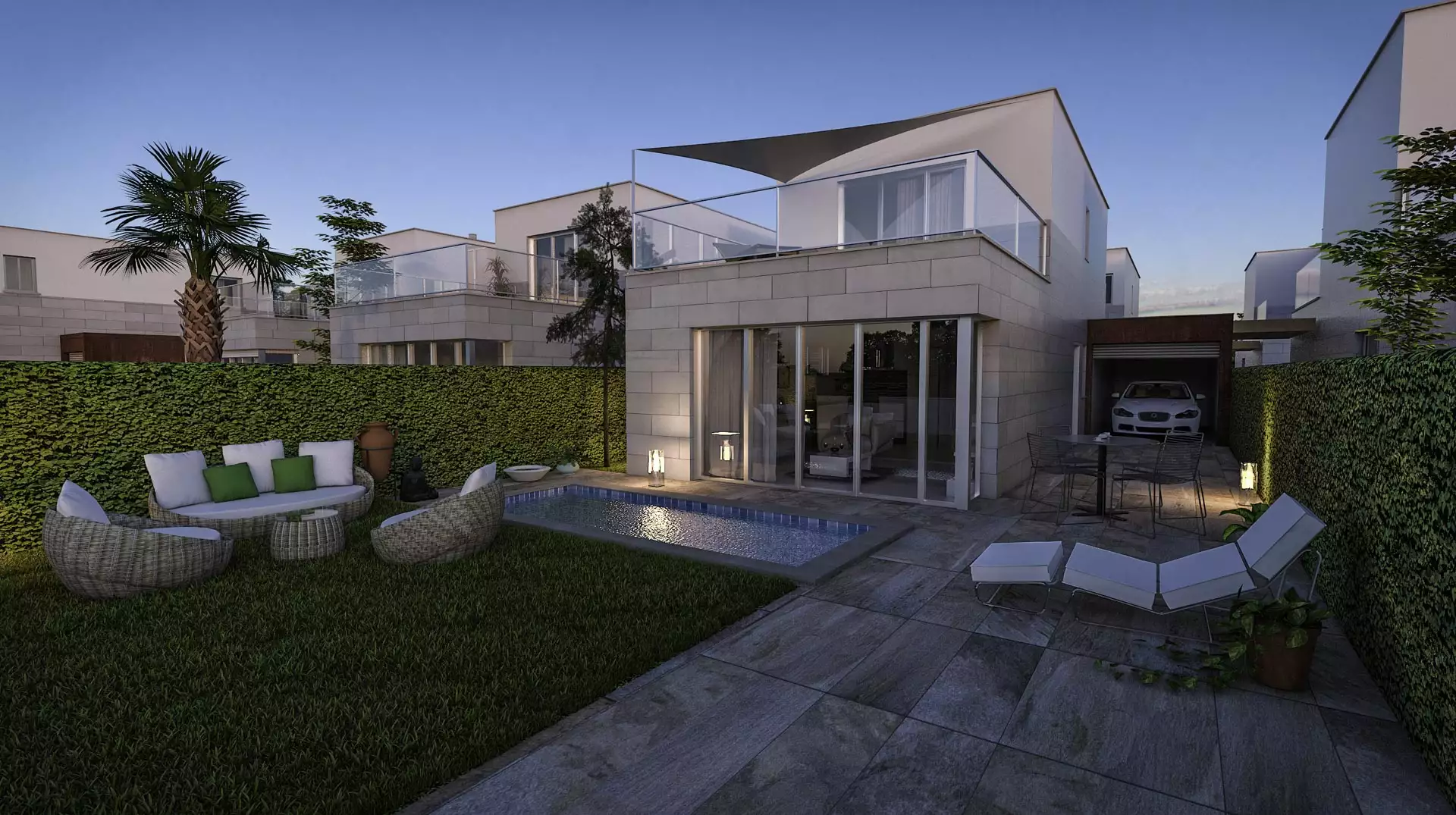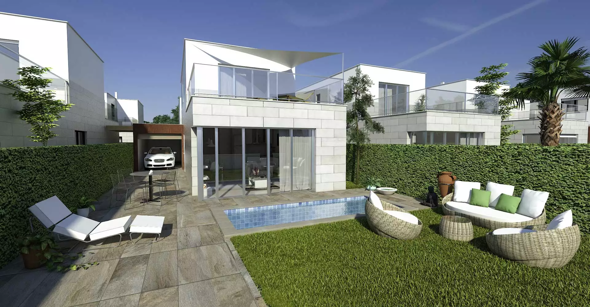Villas with 3 bedrooms and 2 equipped bathrooms in a luxurious residential complex in Los Alcazares, Costa Calida. The concept with open plan includes a fully equipped kitchen, living room and dining room. Each villa has its own private pool, enclosed garage, spacious terraces and private gardens for the sun to shine in every day.