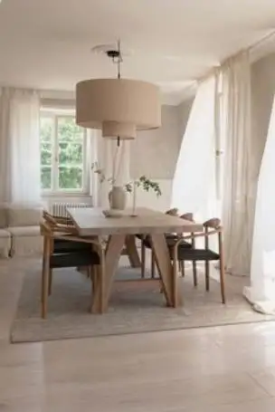 The ground floor features an entrance foyer leading to the open-plan living area without partition walls. Here, a spacious living room with a wood-burning fireplace and sliding glass doors provides access to and views of the courtyard and swimming pool. Adjacent to the living room is a kitchen area with a generous dining space, also with access to the covered terrace. Additionally, the ground floor includes a guest bedroom with an en-suite bathroom and access to the courtyard.