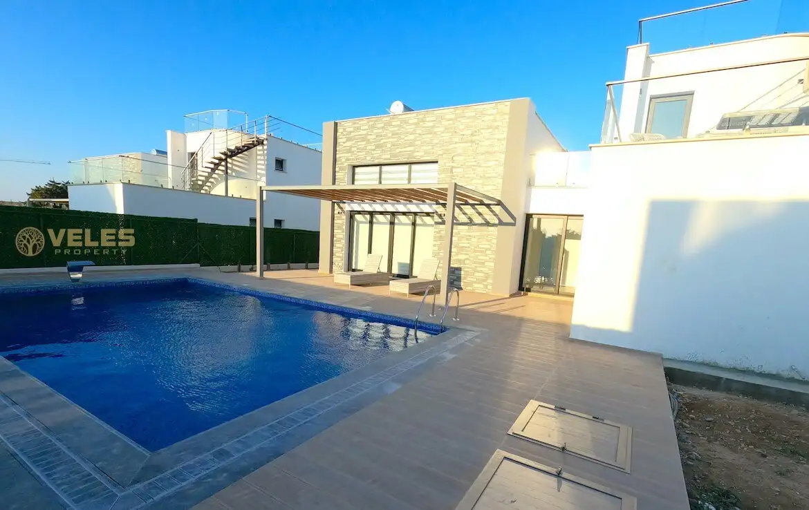 The villas have a very large living area, 220 square meters. The house consists of an open plan living/kitchen/dining area. There is also a large fireplace. Three bedrooms and an additional guest toilet. Each bedroom has its own bathroom and wardrobe.