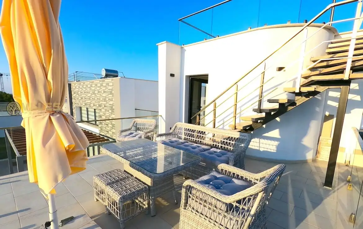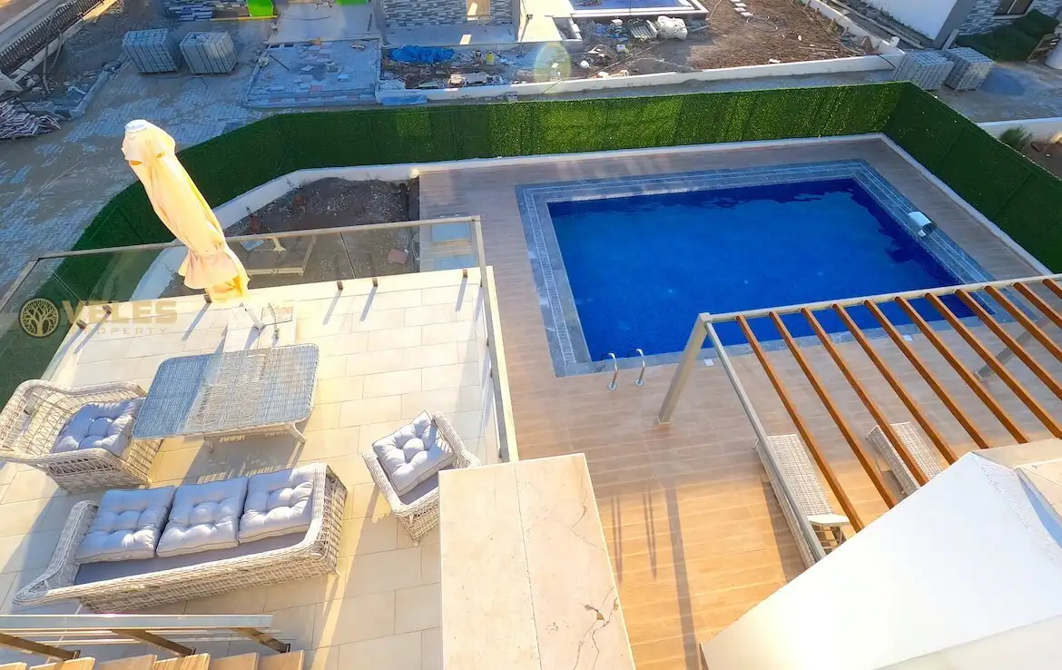 Externally, these are beautifully designed houses. Each villa has its own infinity pool measuring 4 x 8 m, The pool is located in a private garden. There are three levels of spacious terraces to enjoy the breathtaking views of the sea and mountains. Each villa has parking for residents and their guests.