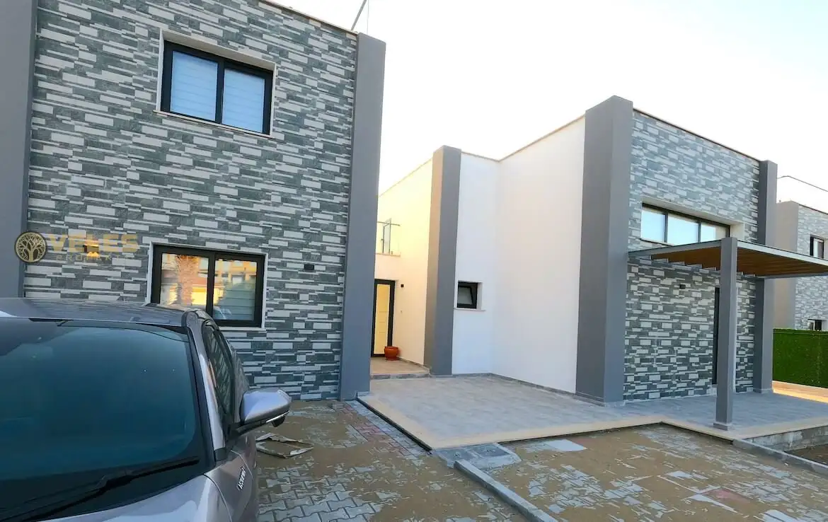 So, we are pleased to present this brand new project of 10 villas. It is located in the quiet area of Karshiaka. Just a 30-minute walk from the western coast of Kyrenia. Moreover, the beach is only a 5-minute walk from the complex.
