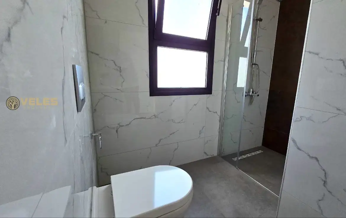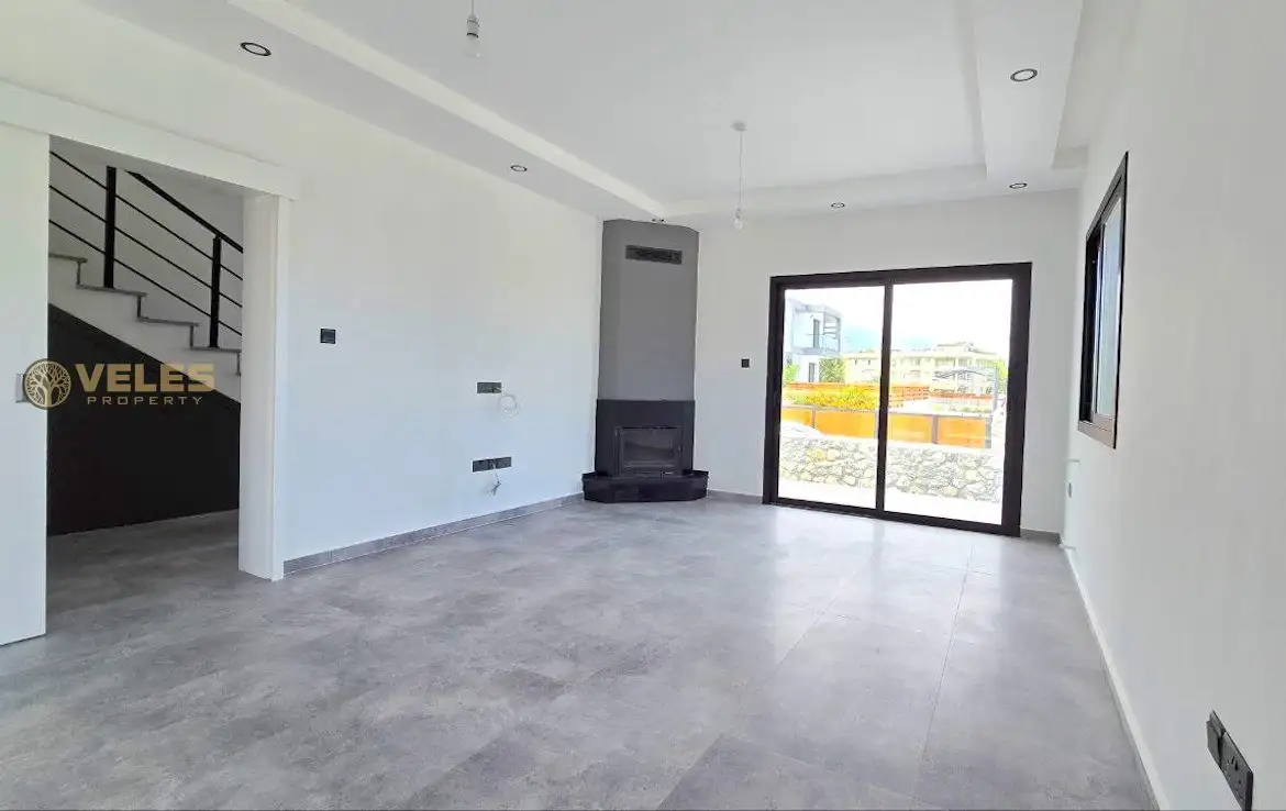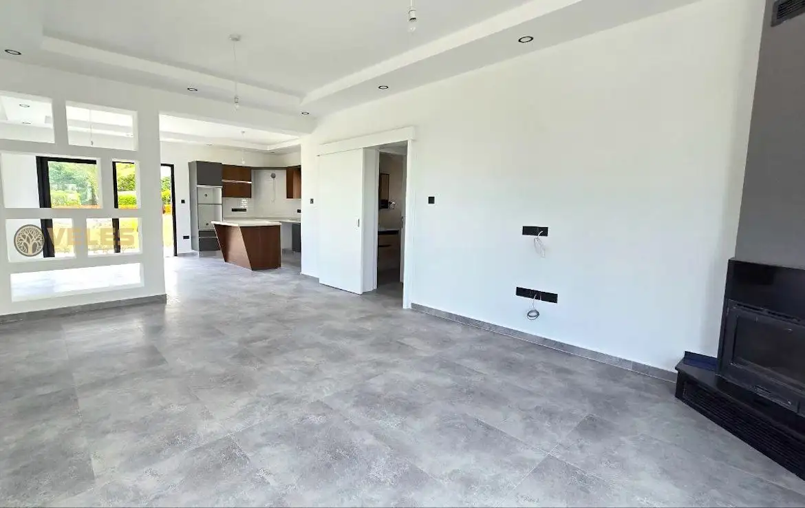 The layout inside the villa is very interesting. At the entrance, there is a hallway separated by a false wall. On the first floor, there is a spacious living room and kitchen. The kitchen leads to a large terrace. Additionally, there is a fireplace in the living room. On the second floor, there are three bedrooms. One of the bedrooms has a balcony. The villa has 3 bathrooms.