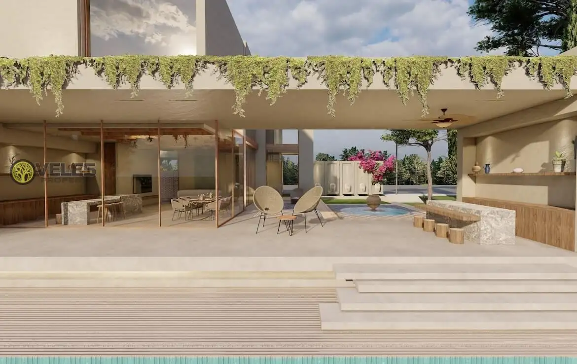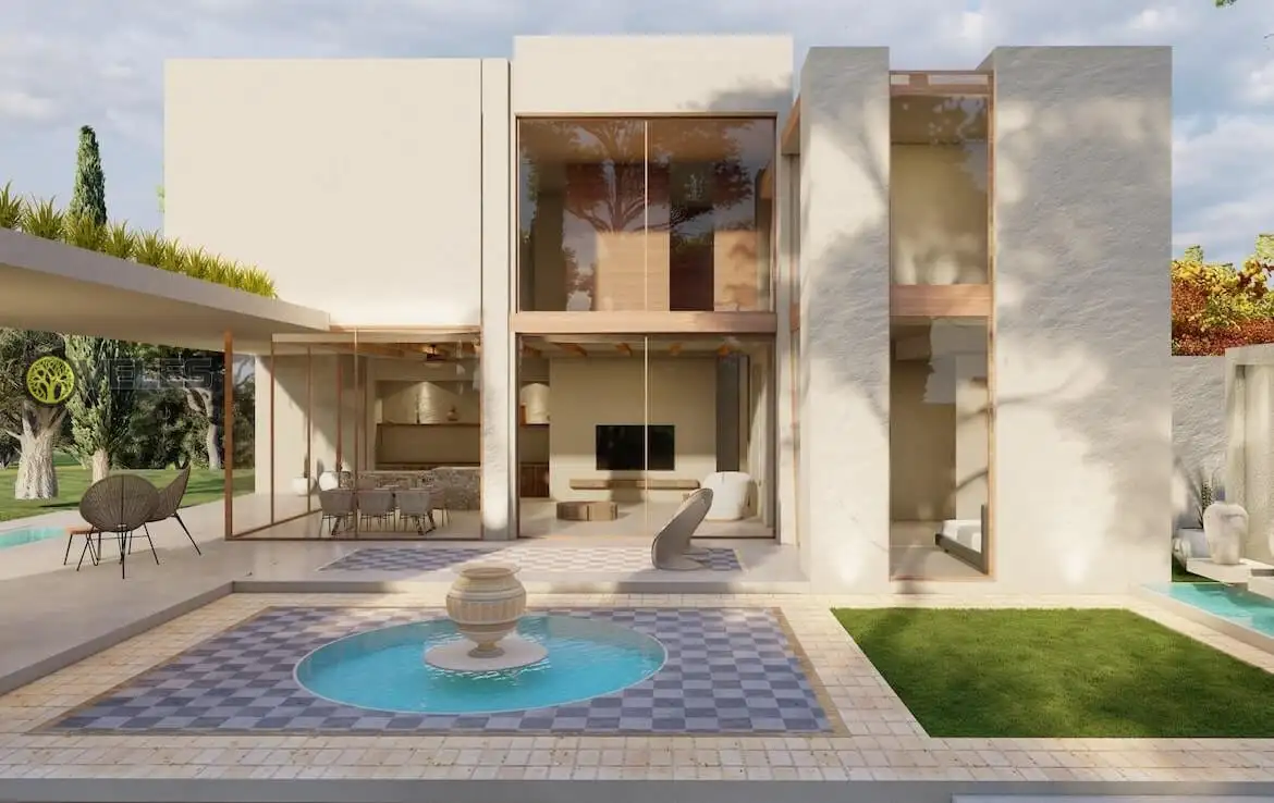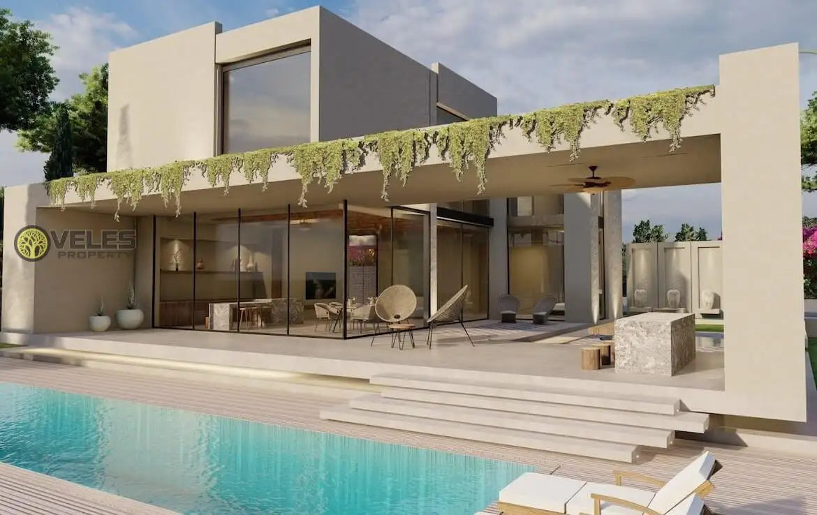 This four-bedroom villa is 255 square meters in size. The terrace is 70 square meters. There is also a rooftop terrace of 90 square meters. The house has four spacious bedrooms, a living room with kitchen, and four bathrooms. The total land area on which the house is located is 600 square meters. And of course, there is a private pool at the house.