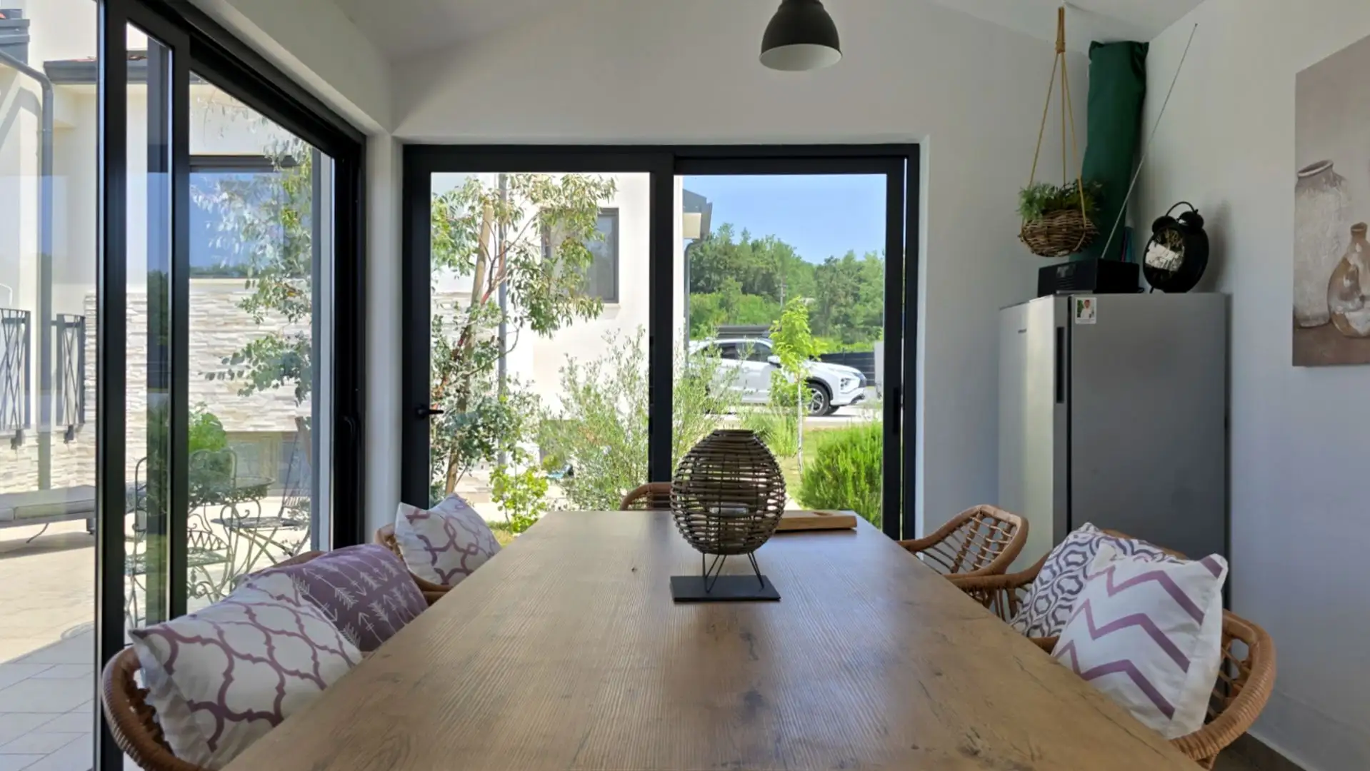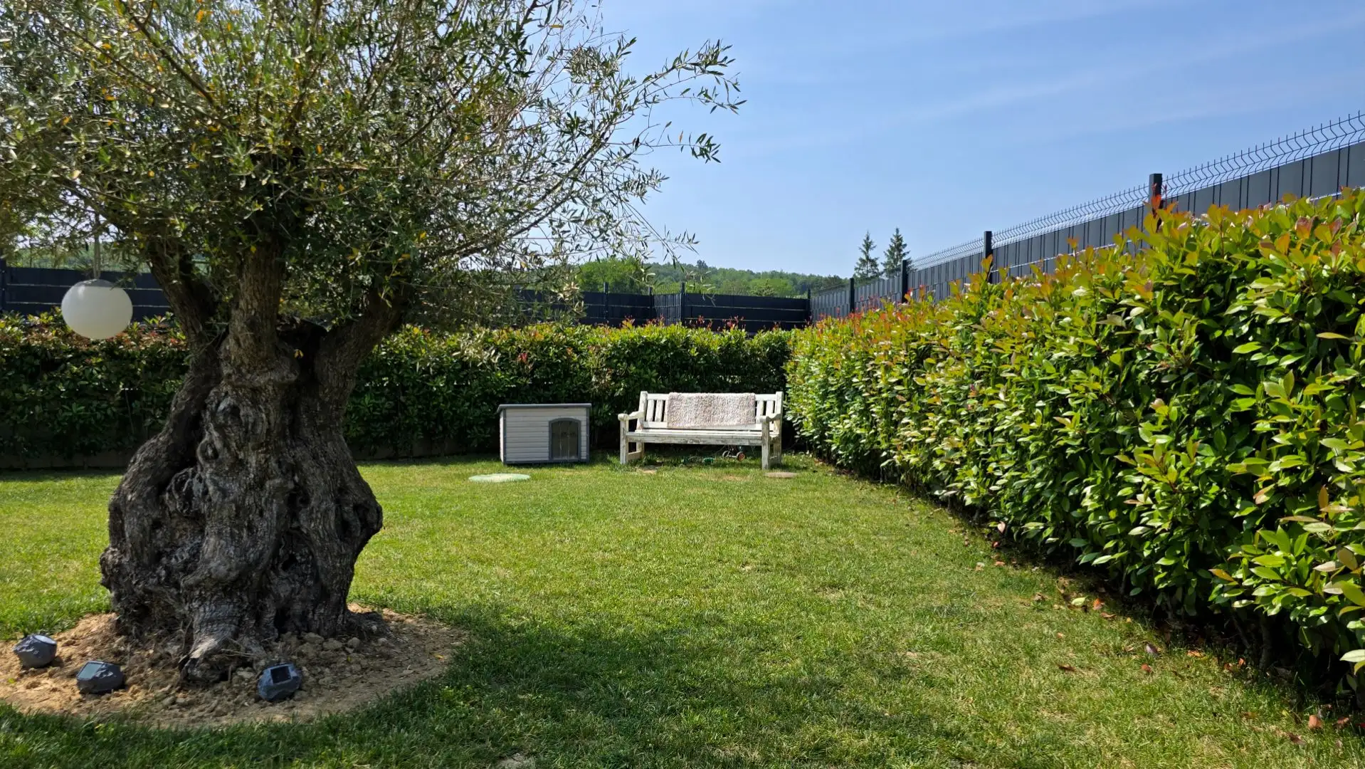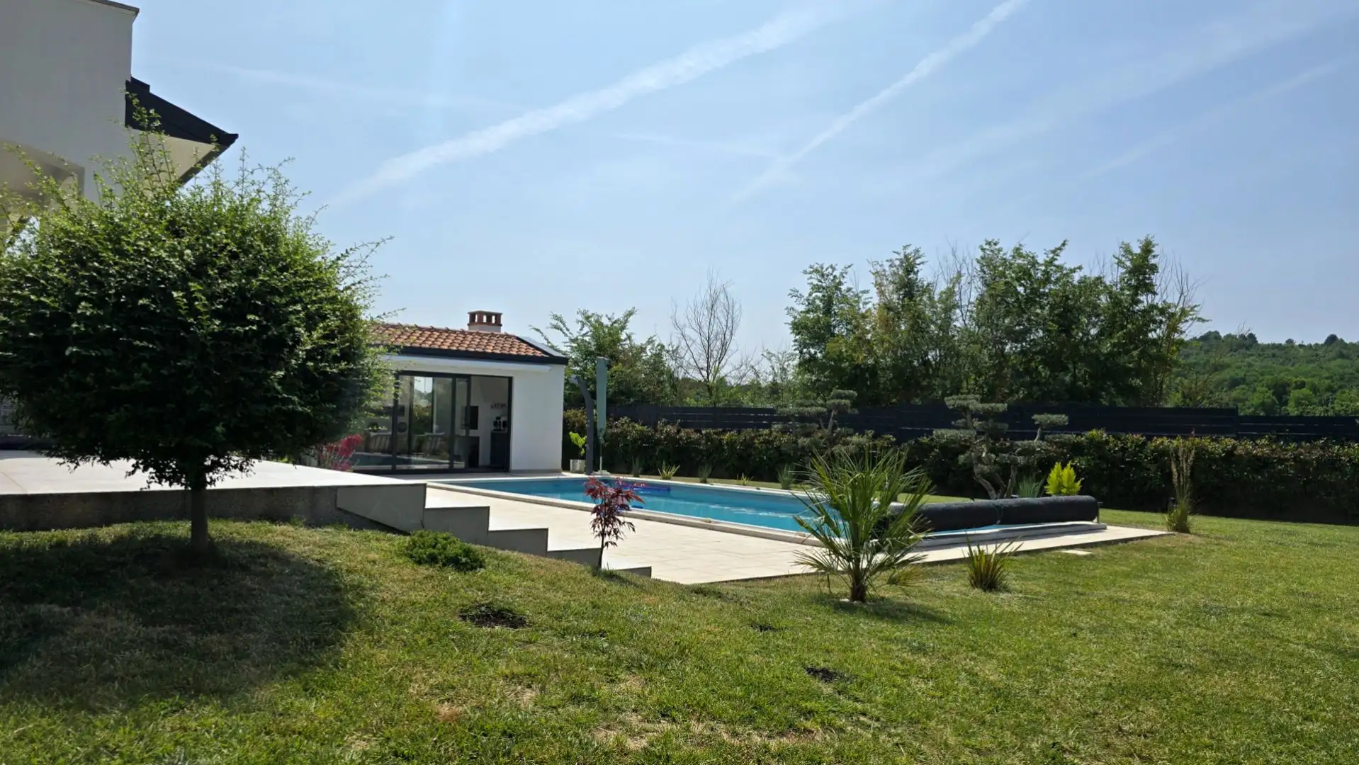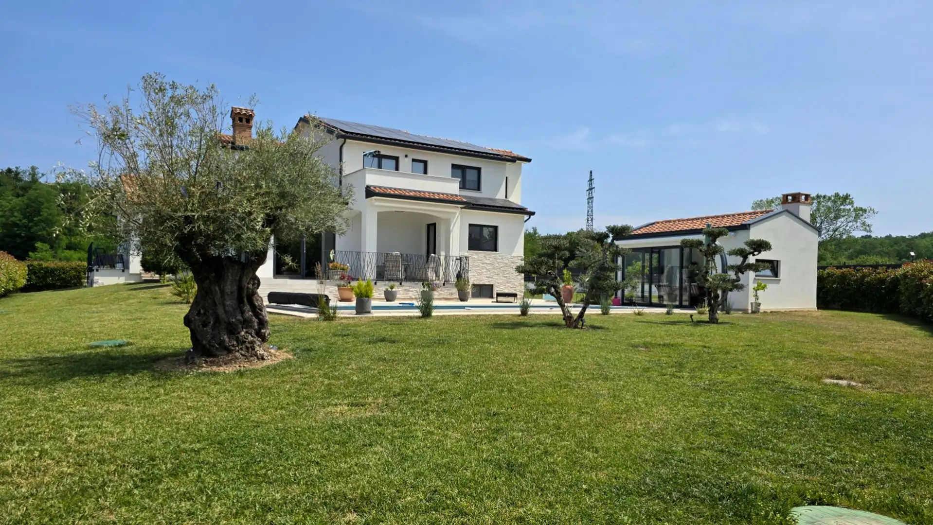 The well-kept and fenced garden includes a 39 m2 pool with a tanning area and a closed summer kitchen of 20 m2 with an open fireplace. Additional features include triple glazing with mosquito nets, electric aluminum blinds, a fan coil system, a warm floor using a heat pump, a wood-burning stove, a 10 kW solar power plant, video surveillance, automatic watering, an electric gate and a Biohort garden house. The pool has daily thermal coverage, and the property has always been used for private purposes, never rented out for tourism. Distances include 800m to the nearest cafe and small shop, 5km to restaurants and wineries, 8.5km to Motovun, 10km to supermarkets, 37.5km to the border crossing of Plavania and 58km to Pula airport.