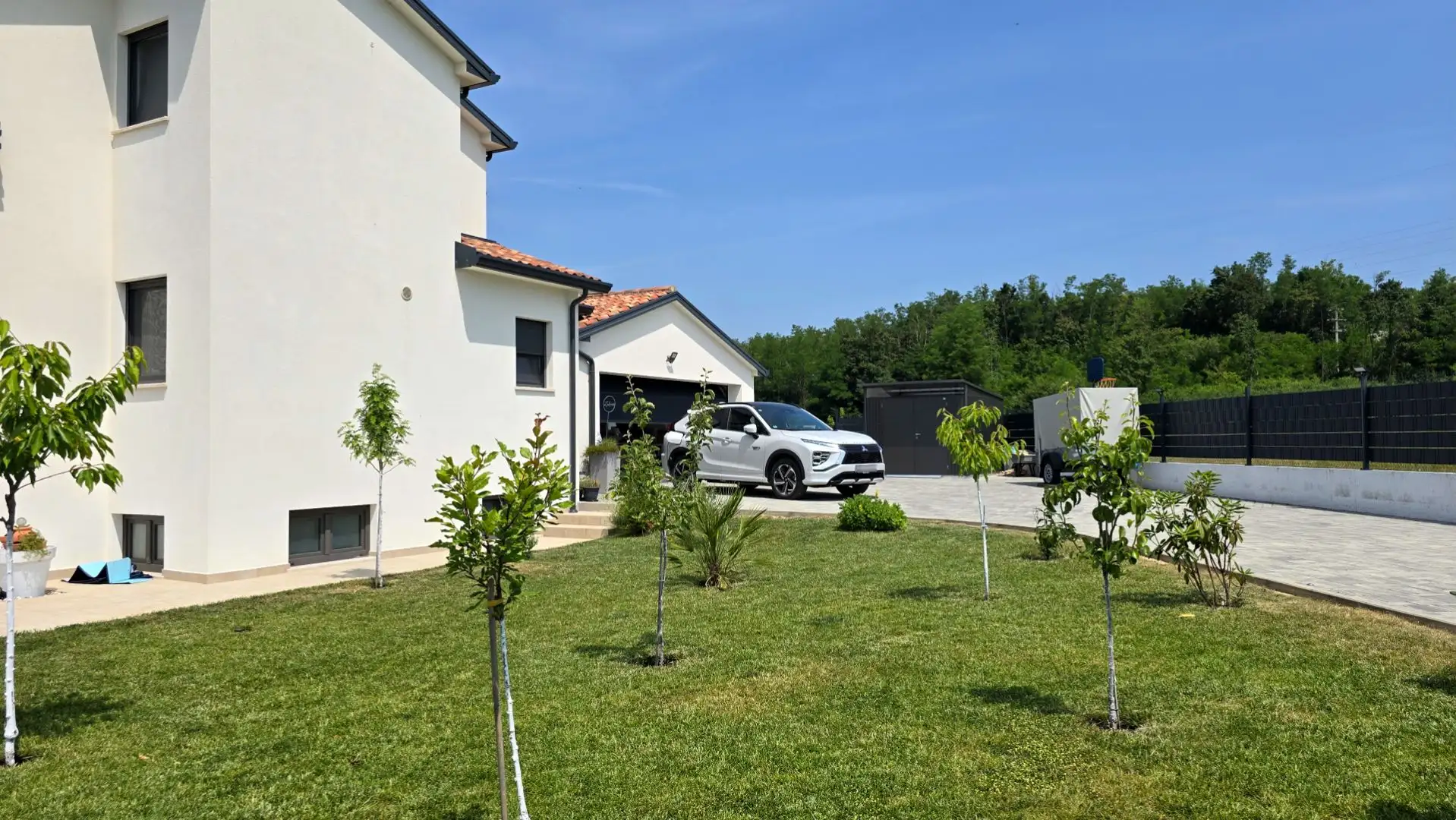 In the basement there is a spacious storage room, which can be converted into a recreation area with a sauna and a gym. On the first floor there is an open-plan kitchen, dining room and living room leading to the covered terrace, as well as a storage room, bathroom and hallway. This level also includes a technical room, a large double garage and a separate apartment with its own entrance, equipped with a kitchen and dining room, a living room with access to a terrace, a bedroom and a bathroom. On the second floor there are three bedrooms, two bathrooms, a laundry room and a terrace.