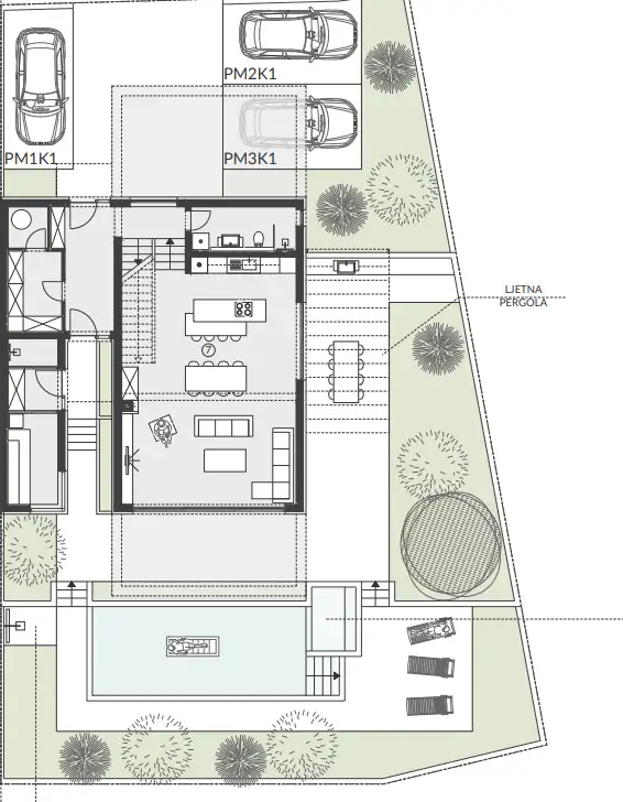 The villa is designed on three levels: first floor, second floor and third floor, all designed for maximum comfort, natural light and continuous sea views. On the first floor there is an entrance hall, storage room, technical room and a separate SPA area with a sauna and shower. The spacious living room, kitchen and dining room in an open plan are surrounded by large glass walls, creating a bright, elegant atmosphere and a strong connection with the open space. From the living room there is direct access to a large covered terrace, which smoothly connects to the infinity pool and Jacuzzi, offering stunning sea views even while relaxing indoors or by the pool.