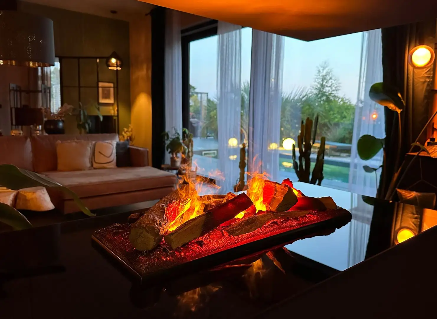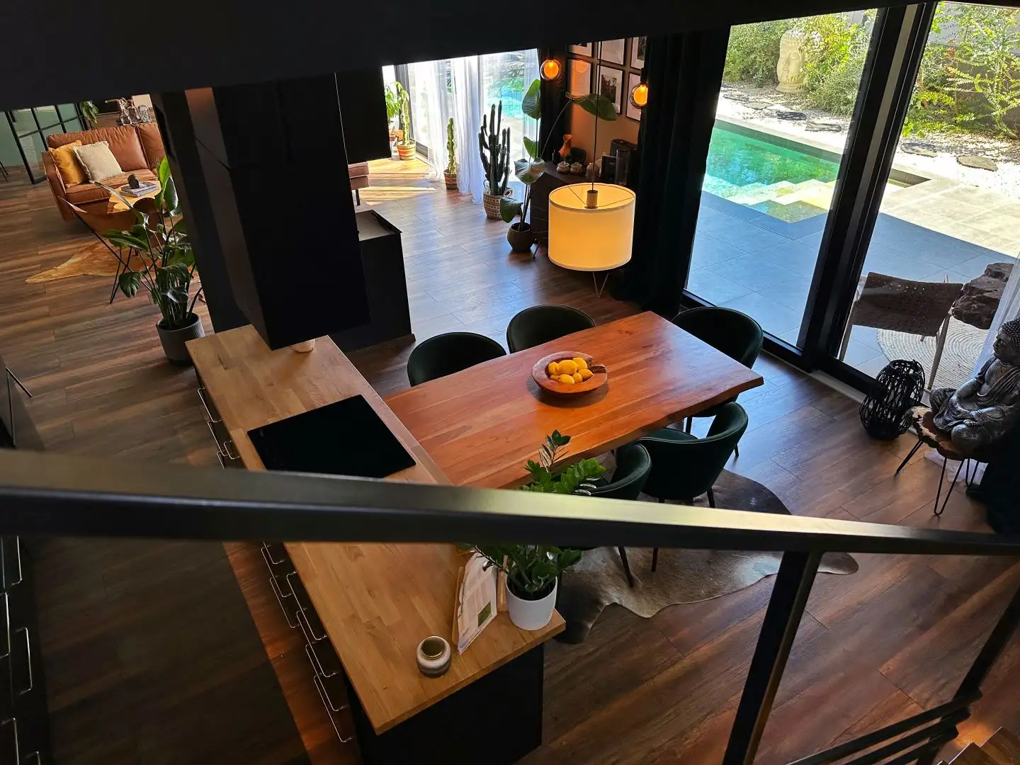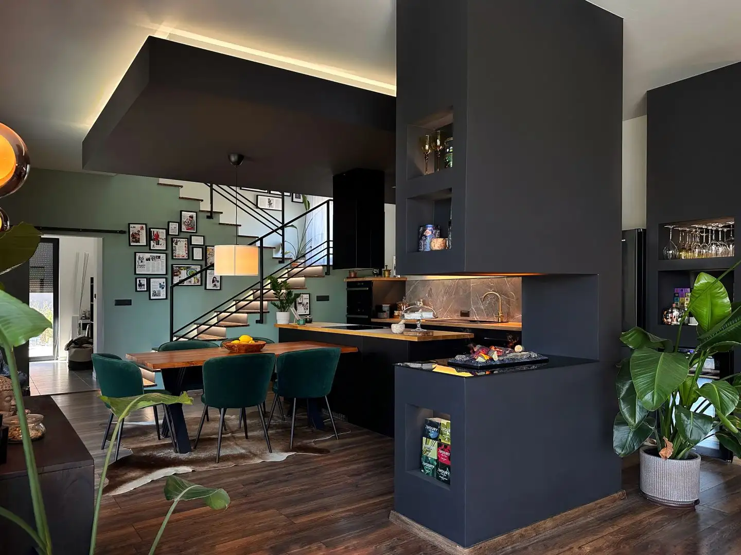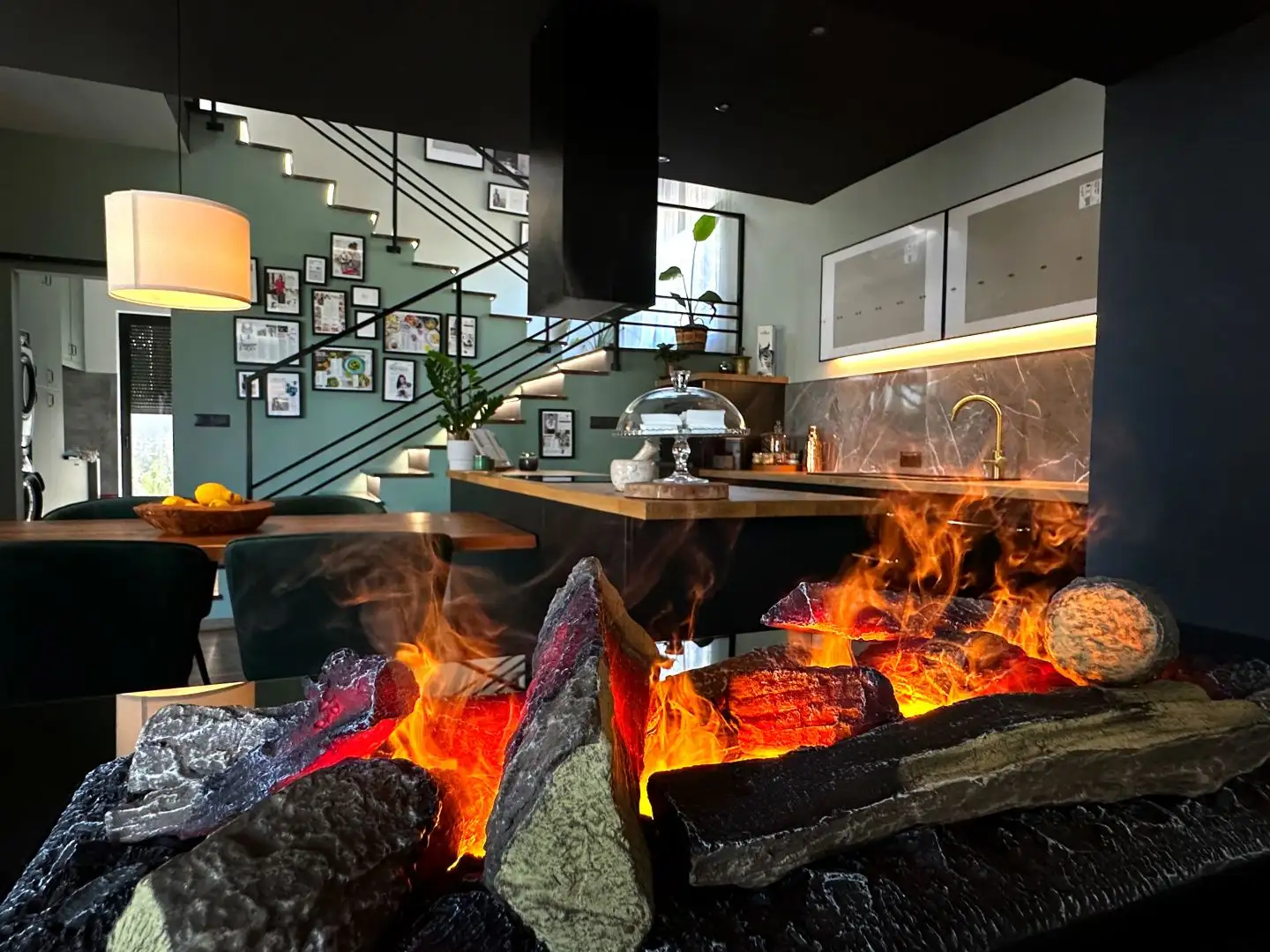 On the first floor of the villa there is an elegant hall that leads us to an open living area combining a modern kitchen with an island, a spacious dining room and an even more spacious living room. The space is complemented by a modern electric fireplace, which is the central point and infinitely separates the living room from the kitchen and dining room, creating a special atmosphere during your stay in the villa. The fireplace is used more as an element of the atmosphere than to heat the space. What we should definitely highlight is the large sliding glass walls that open the space to a landscaped garden and without compromise connect the interior of the villa with its yard. This floor also has a laundry room, storage room, guest toilet and first bedroom, ideal for guests or as an office, which has its own bathroom and direct access to the covered terrace and swimming pool.