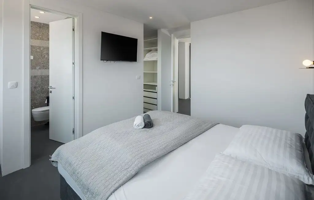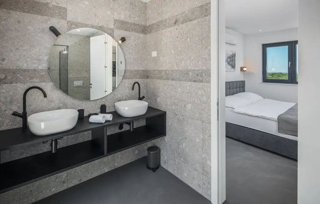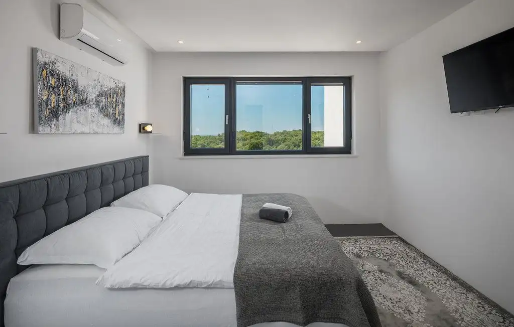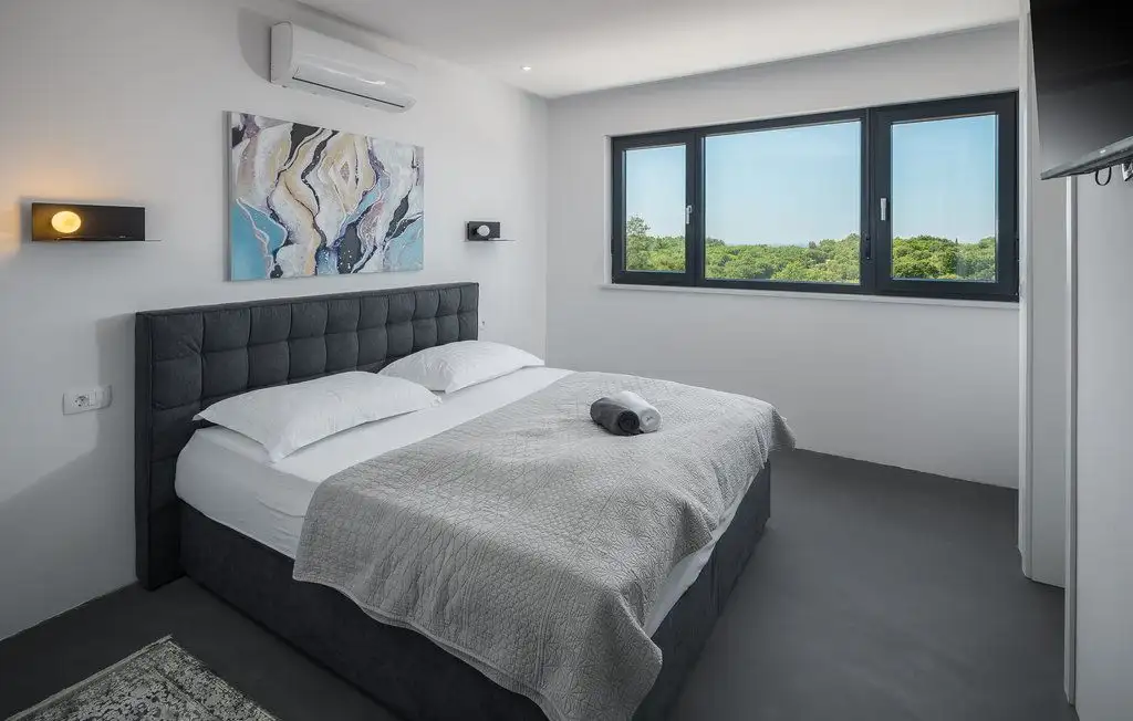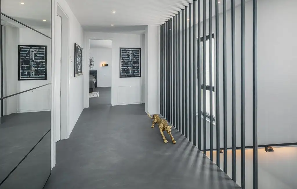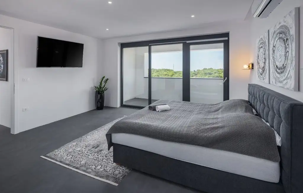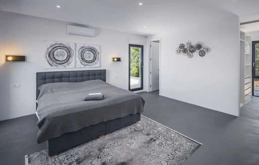 The villa occupies two floors of pure luxury, namely, the interior is decorated with works of art by academic artists, bathrooms of the highest quality from world-known manufacturers. The covered exterior entrance leads to the hallway, which goes into the open concept of the living area of the villa. A modern and fully equipped kitchen with dining area and a spacious living room are connected to the exterior of the villa by large glass walls. On the partially covered outdoor terrace there is a dining room, and in the continuation of the terrace there is an infinity pool surrounded by a tanning area. On the same floor there is a pantry, wardrobe and toilet. The extra room can be decorated as a spa area. Beautiful internal stairs lead to the first floor of the villa, where there are three bedrooms. All rooms have their own bathroom, while two rooms have dressing rooms. There is also a loggia in the main room. Part of the flat roof consists of two spacious covered terraces with panoramic views of the surrounding area. Heating is carried out with the help of heat pumps, cooling - with the help of air conditioners. Prepared conditions for the warm floor.