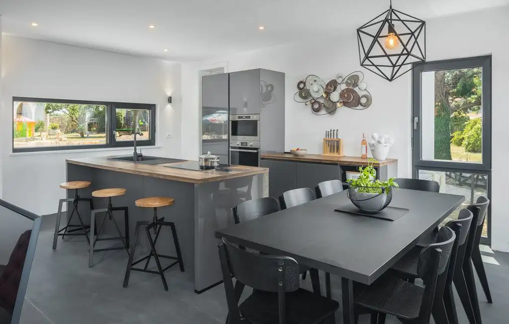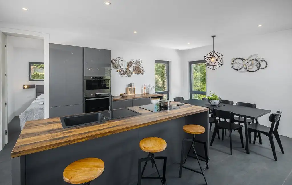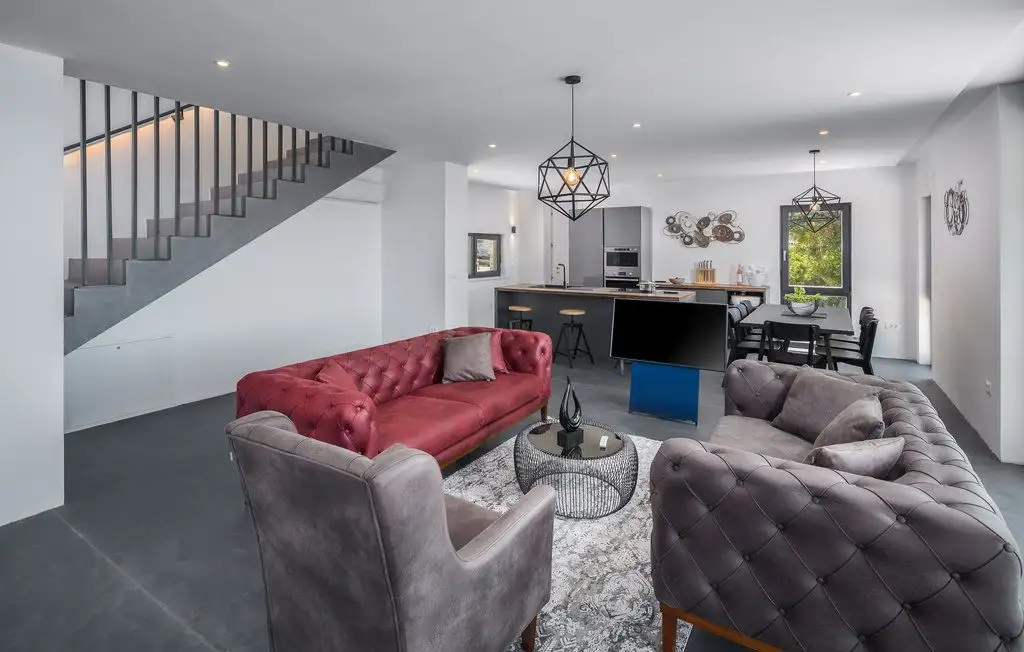 A modern villa with an area of 255 sq.m. with a swimming pool is located in a quiet location near Buja and is surrounded by untouched nature on a land plot of 660 sq.m.