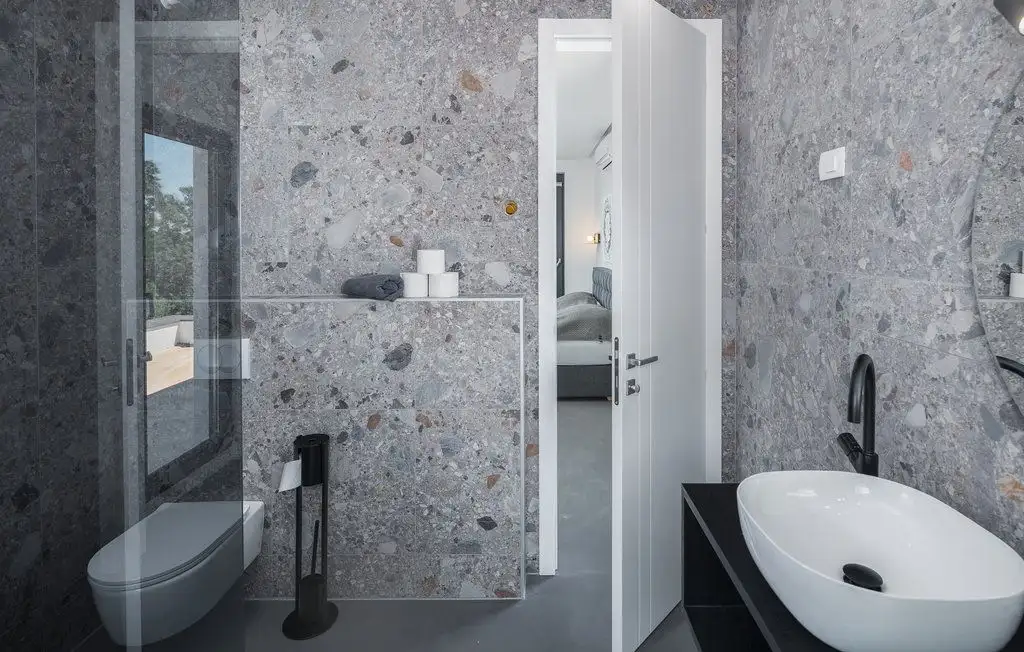 The villa is a perfect combination of modern architecture and traditional stone Mediterranean elements used in the facade of the villa.