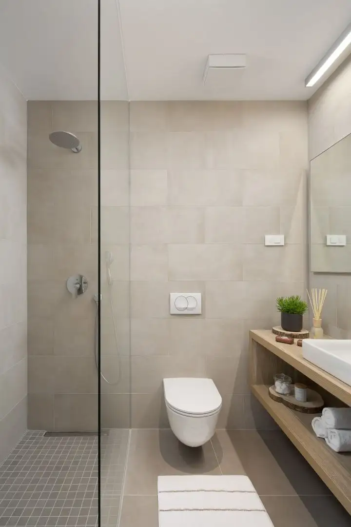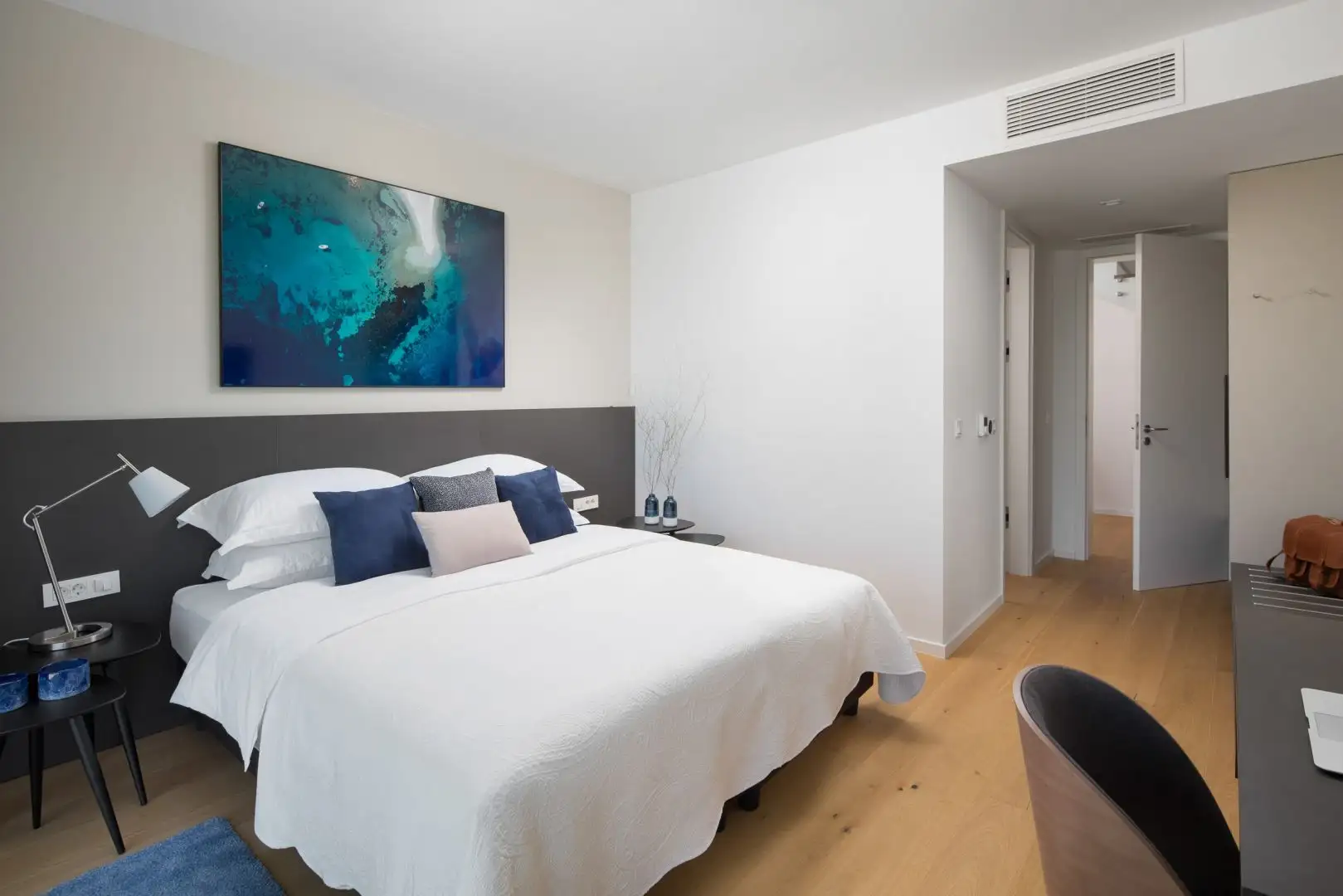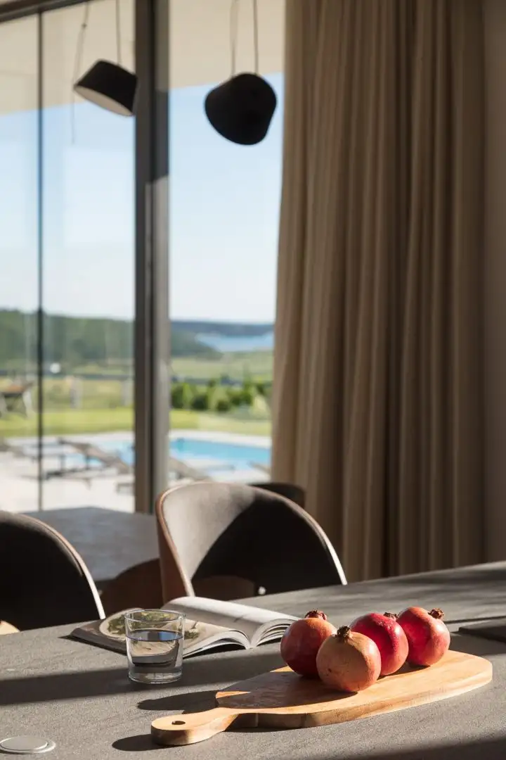Built in a modern style using top quality materials, the villa features high ceilings and triple glazed windows and electric blinds, reflecting elegance and modern design. Stone and wooden details add warmth and character, enhancing the feeling of comfort and sophistication throughout the space.
