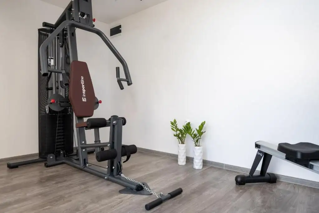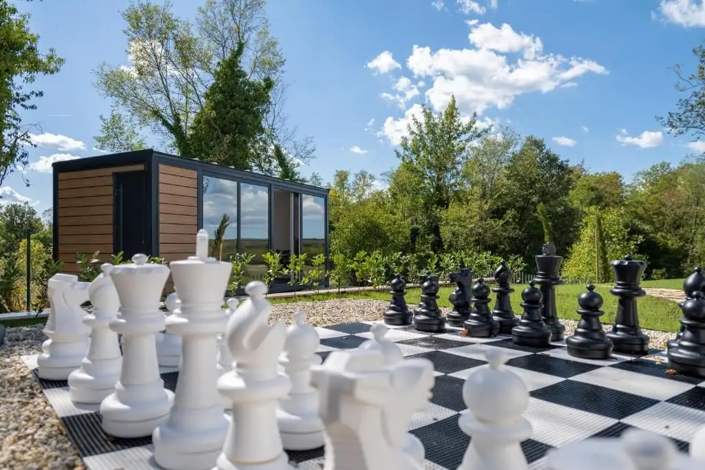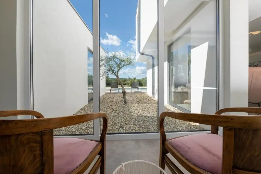 The open space is designed for relaxation and enjoyment. The heated swimming pool is surrounded by a sun terrace with eight sun loungers, a five-person Jacuzzi, an outdoor shower and a Mediterranean garden. An indoor summer kitchen with a barbecue and dining area is ideal for eating outdoors, and a relaxing terrace allows you to enjoy sunsets and nature. For outdoor activities, a private gym and garden chess are provided.