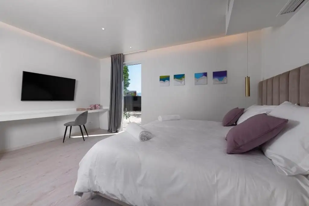 The property offers tranquil views of farmland planted with lavender and fig trees, creating a peaceful environment just minutes from the Adriatic coast. On the ground floor is a spacious living room with a smart TV, PlayStation console and upholstered furniture, which is seamlessly connected to an eight-person dining area and a fully equipped designer kitchen. A private home office provides a quiet workspace, perfect even during the holidays.