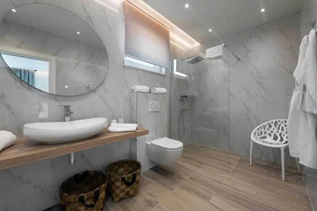 On the ground floor there are two luxurious bedrooms with bathrooms, one of which is fully adapted for people with disabilities, both have direct access to the terrace. On the second floor there are two more elegant bedrooms with their own bathrooms, a dressing room and access to a panoramic terrace overlooking vineyards, olive groves and lavender fields. All bathrooms are equipped with high-quality plumbing and exquisite design elements.